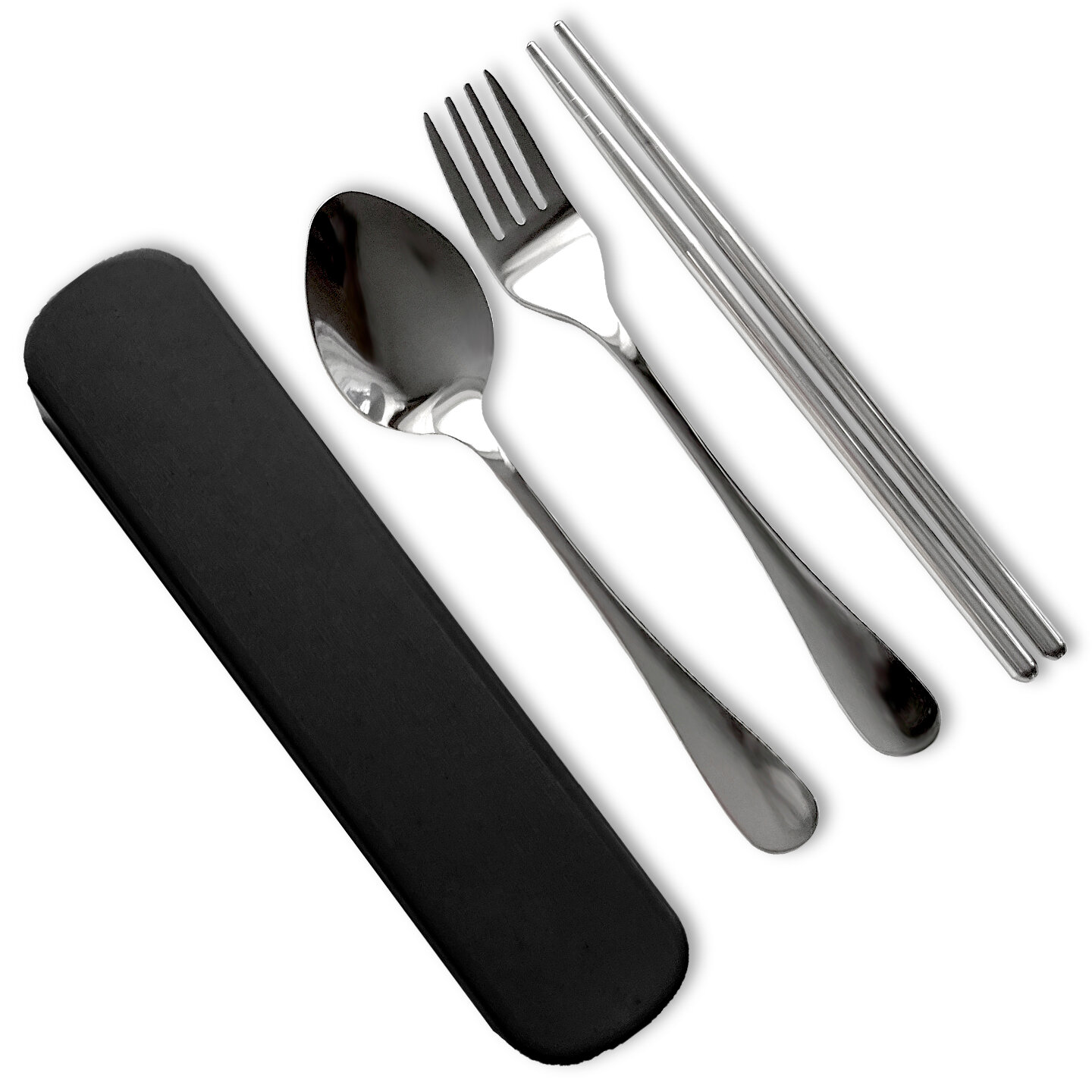 Набор качественных столовых приборов, дорожный - 3 предмета в футляре (вилка, ложка , китайские палочки из нержавеющей стали), черный