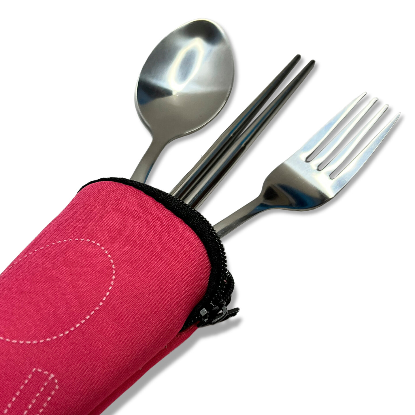 Набор качественных столовых приборов, дорожный - 3 предмета в футляре (вилка, ложка , китайские палочки из нержавеющей стали), розовый