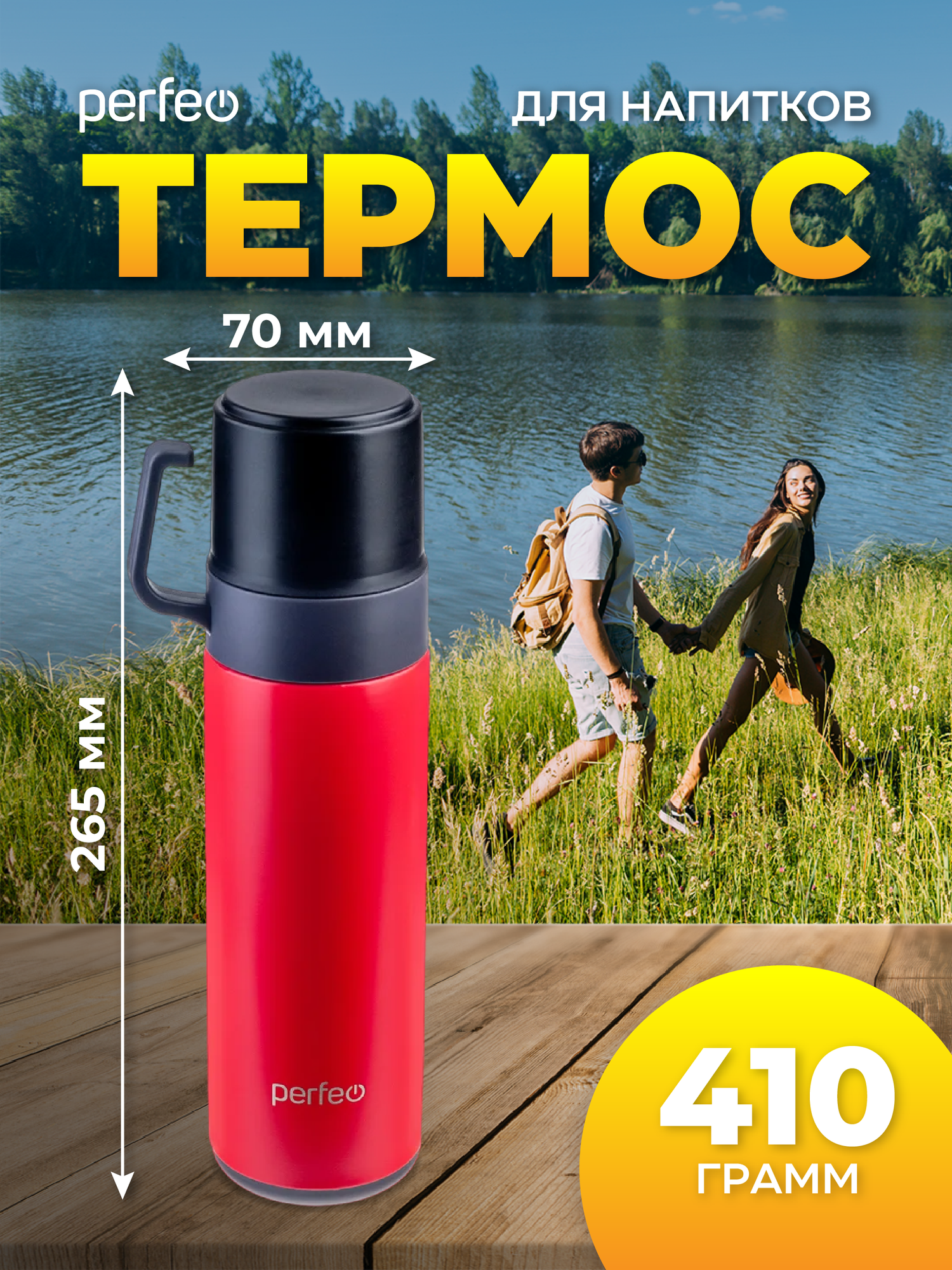 Термос PERFEO для напитков с пробкой-кнопкой, кружкой, объем 0,6 л, красный (PF_D0206) интересное: