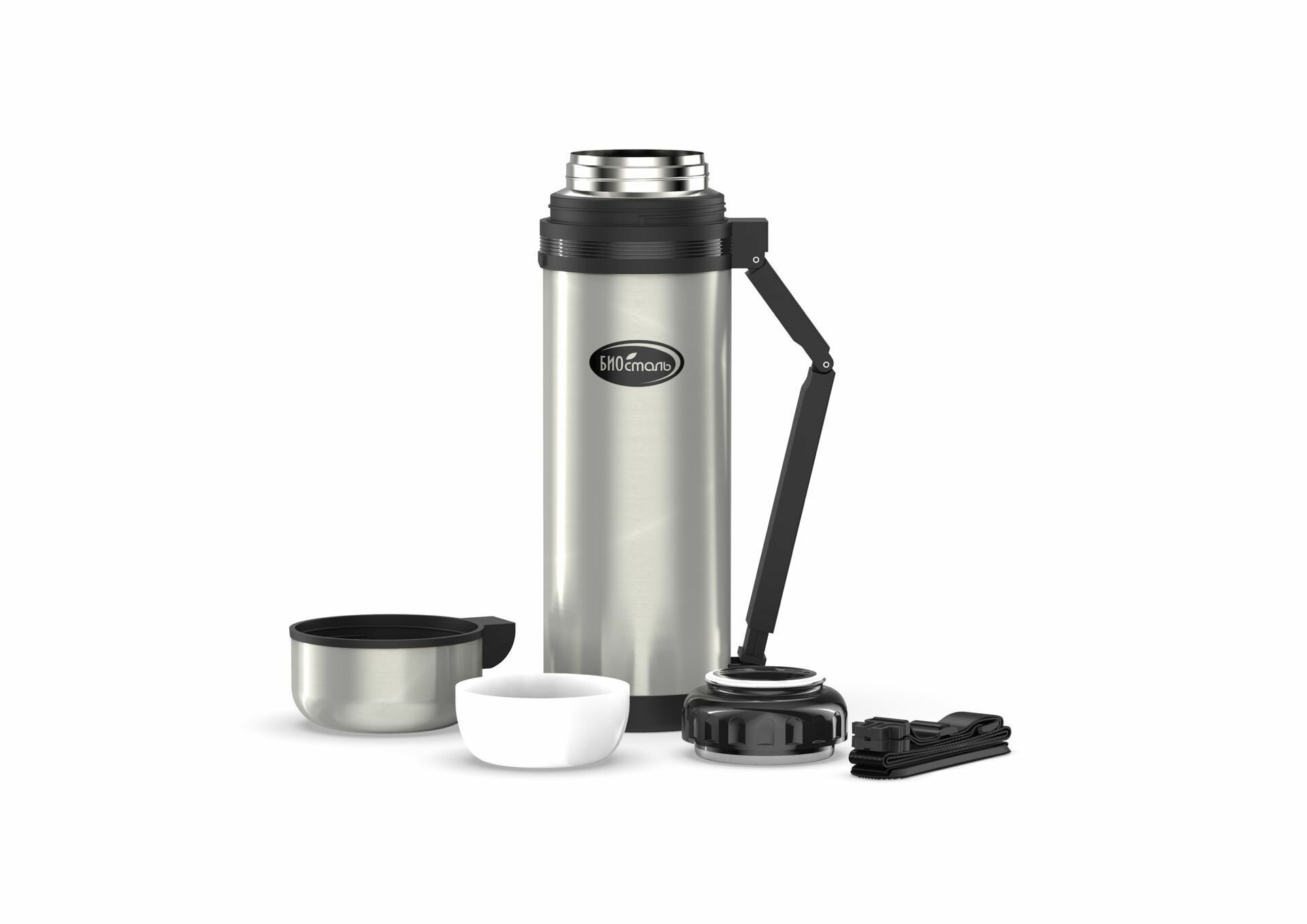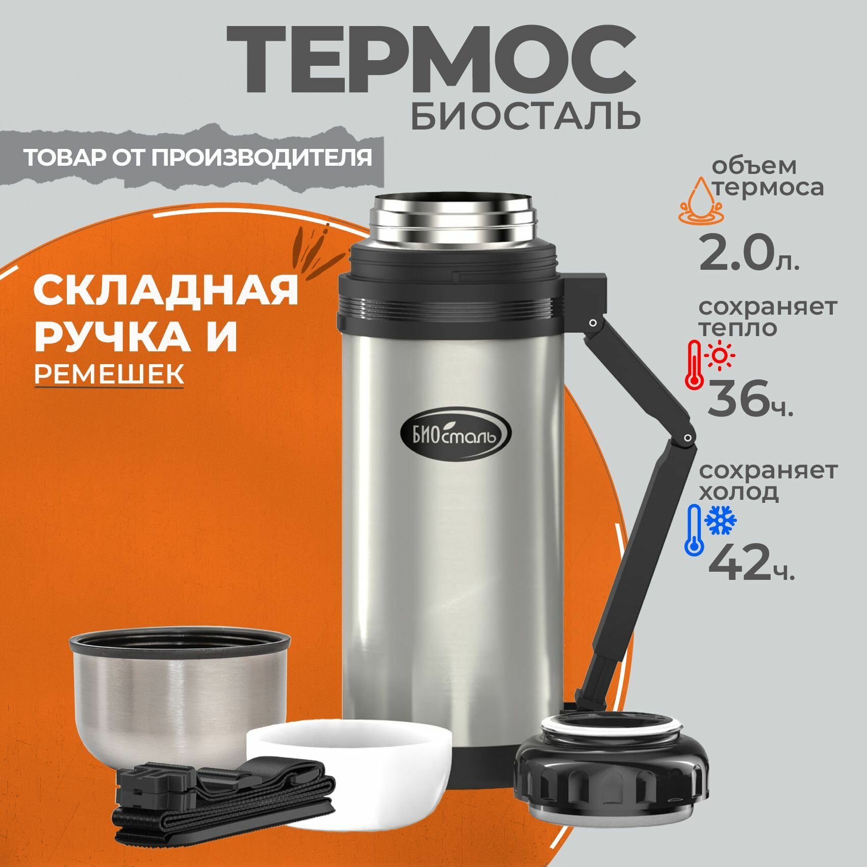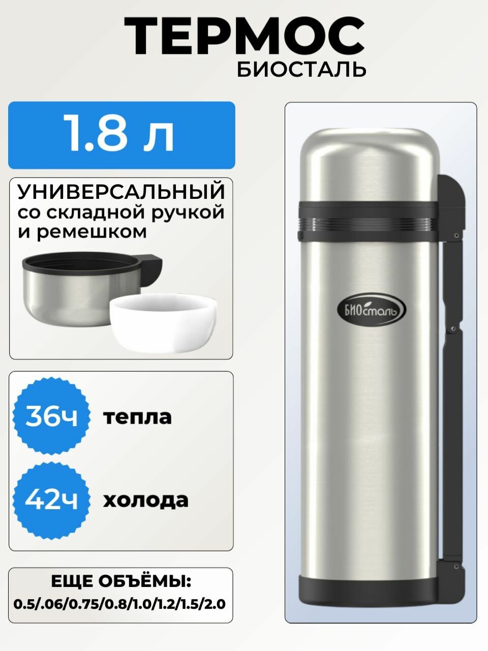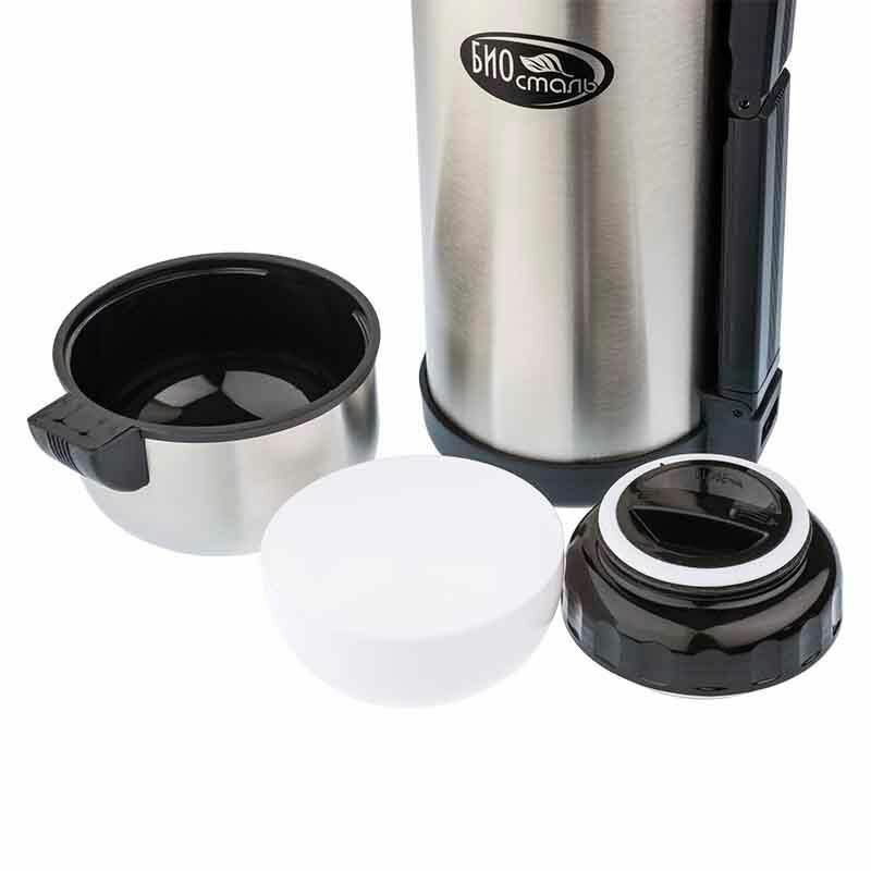 Термос 1.8 литра Биосталь - туризм универсальный, для еды и напитков, две чашки, ручка для переноски, (1800 мл) Biostal интересное: