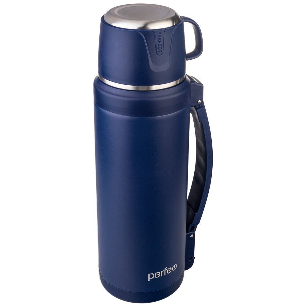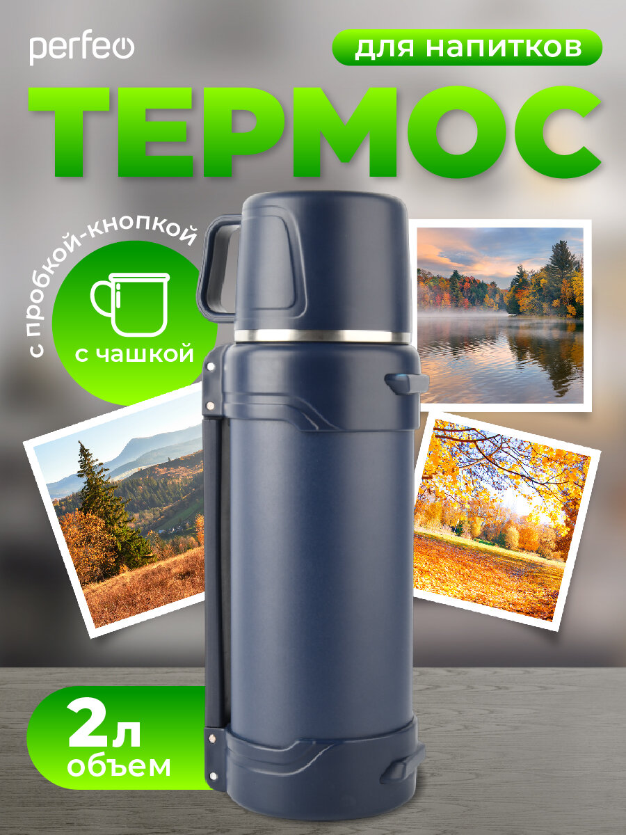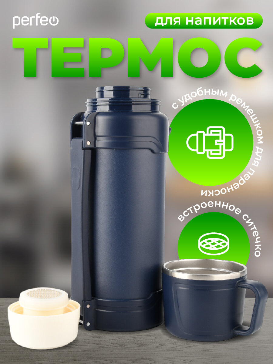 Термос PERFEO для напитков с к/п, ситечком, чашкой, ручкой, ремнем, объем 2 л, синий (PF_E1363) интересное: