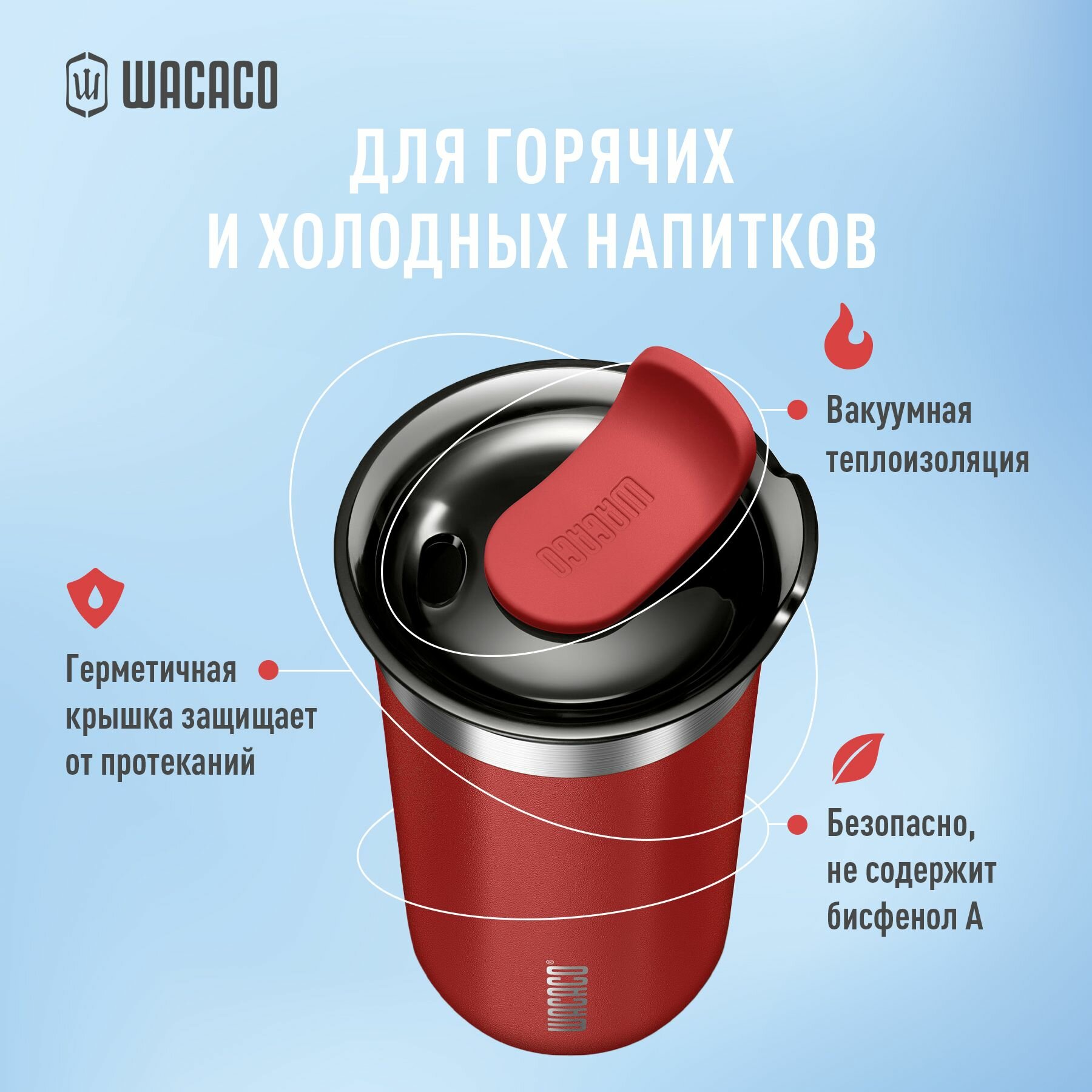 Термокружка для чая или кофе Wacaco Octaroma с вакуумной изоляцией, из нержавеющей стали с двойными стенками и герметичной крышкой WCCOCTR435, объем 435 мл, цвет красный