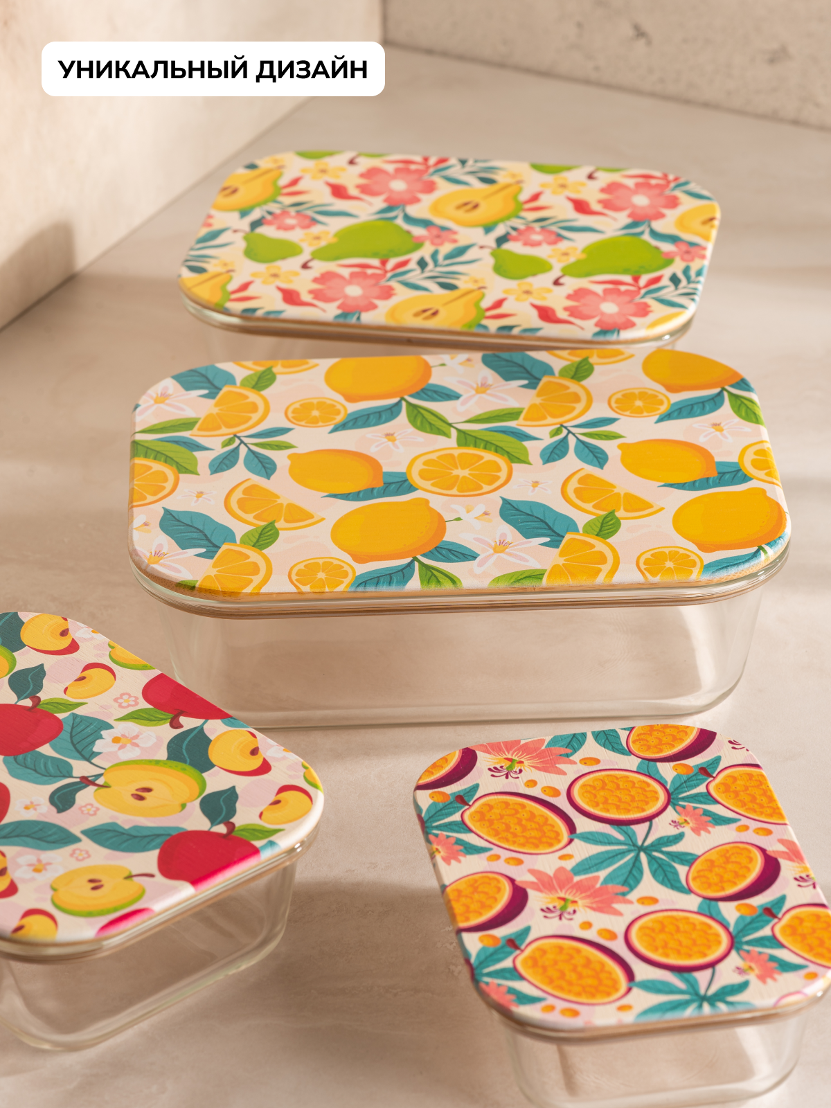Набор стеклянных контейнеров для еды Rohaus с цветной крышкой из бамбука 4 штуки: 370мл, 650мл, 1000мл, 1500мл интересное: