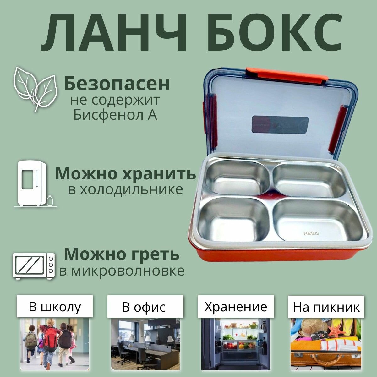 Ланч бокс контейнер для еды с 4 секциями - зеленый , 28х21х7 / металлический