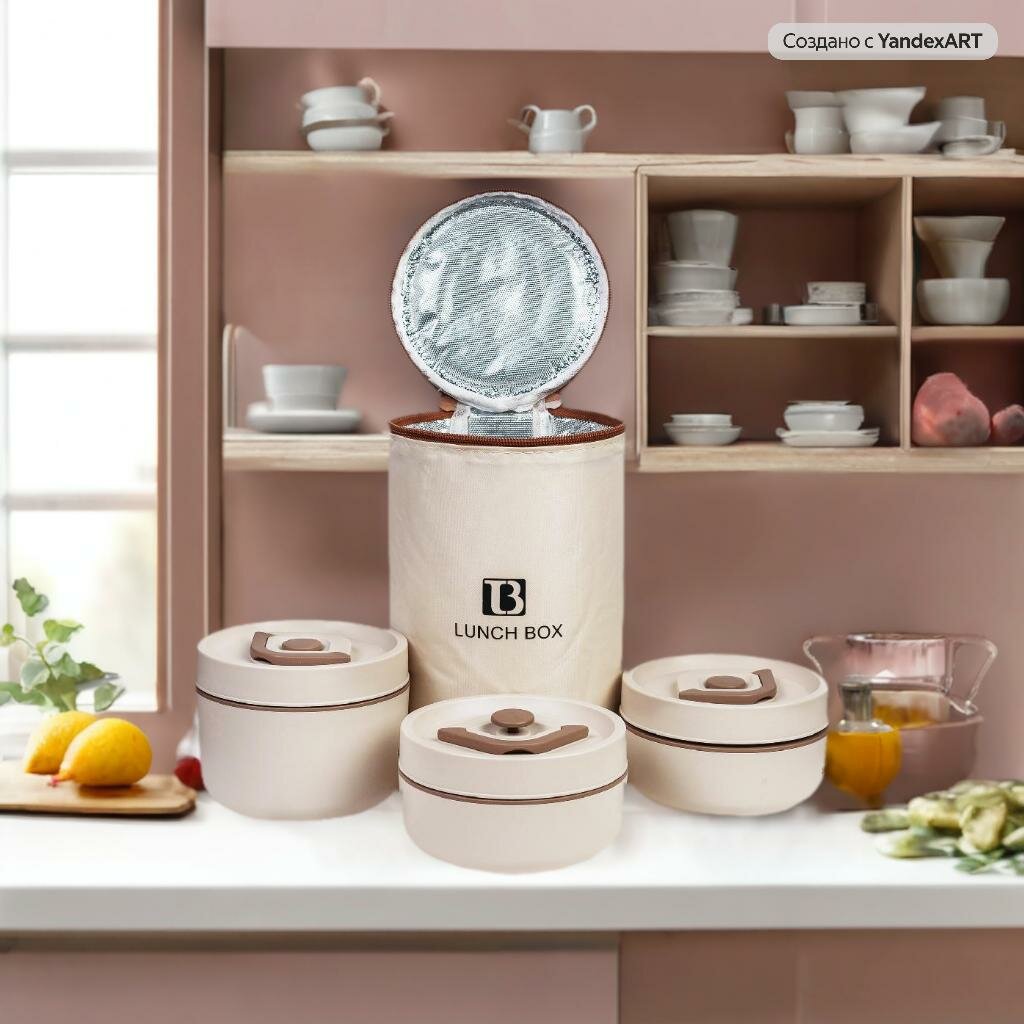 Lunch Box с тремя термо-контейнерами герметичными металл. отделениями для еды, супа, с термо-сумкой для школы 1.4л. Сталь внутри интересное: