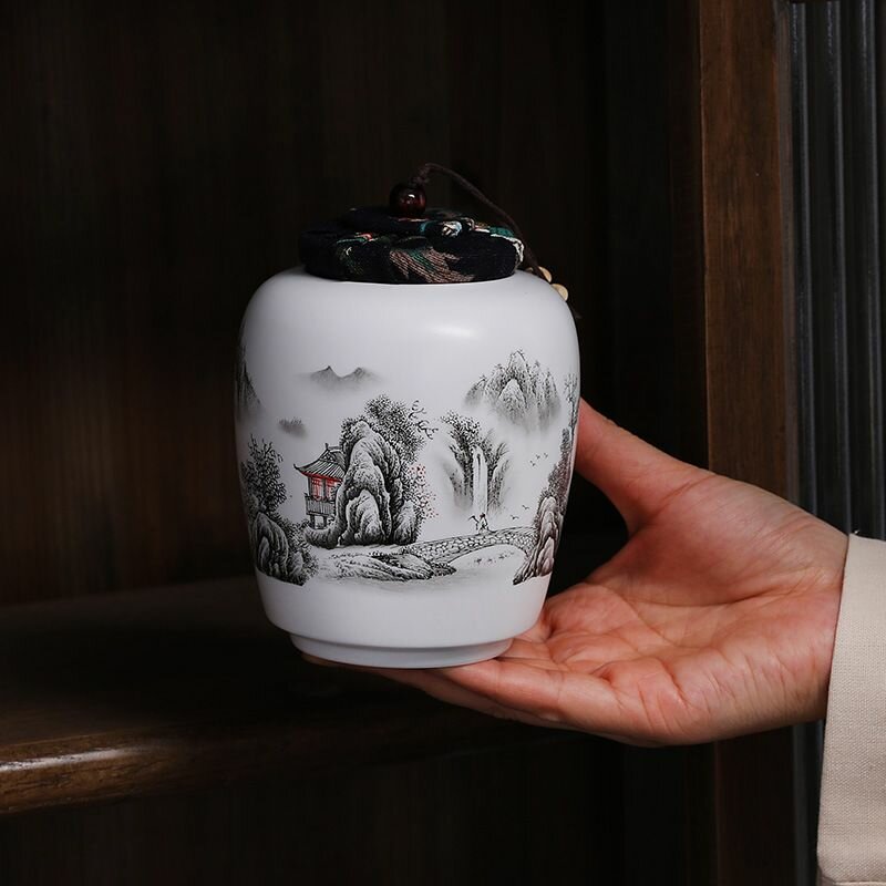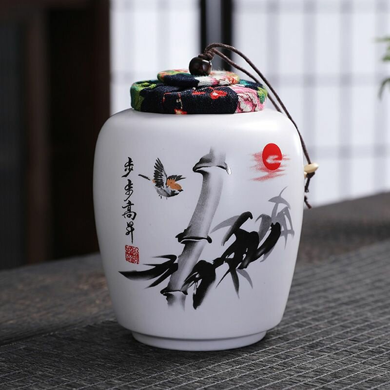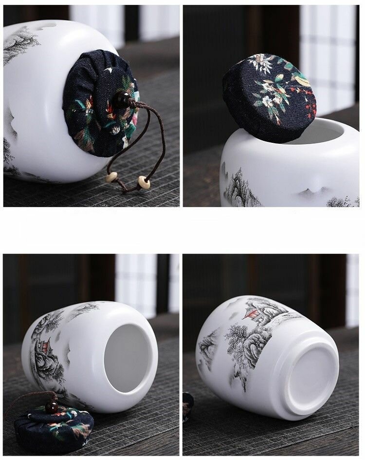 Банка для хранения чая и сыпучих продуктов "Водный городок Цзяннань", 450 мл./ керамическая, с тканевой крышкой