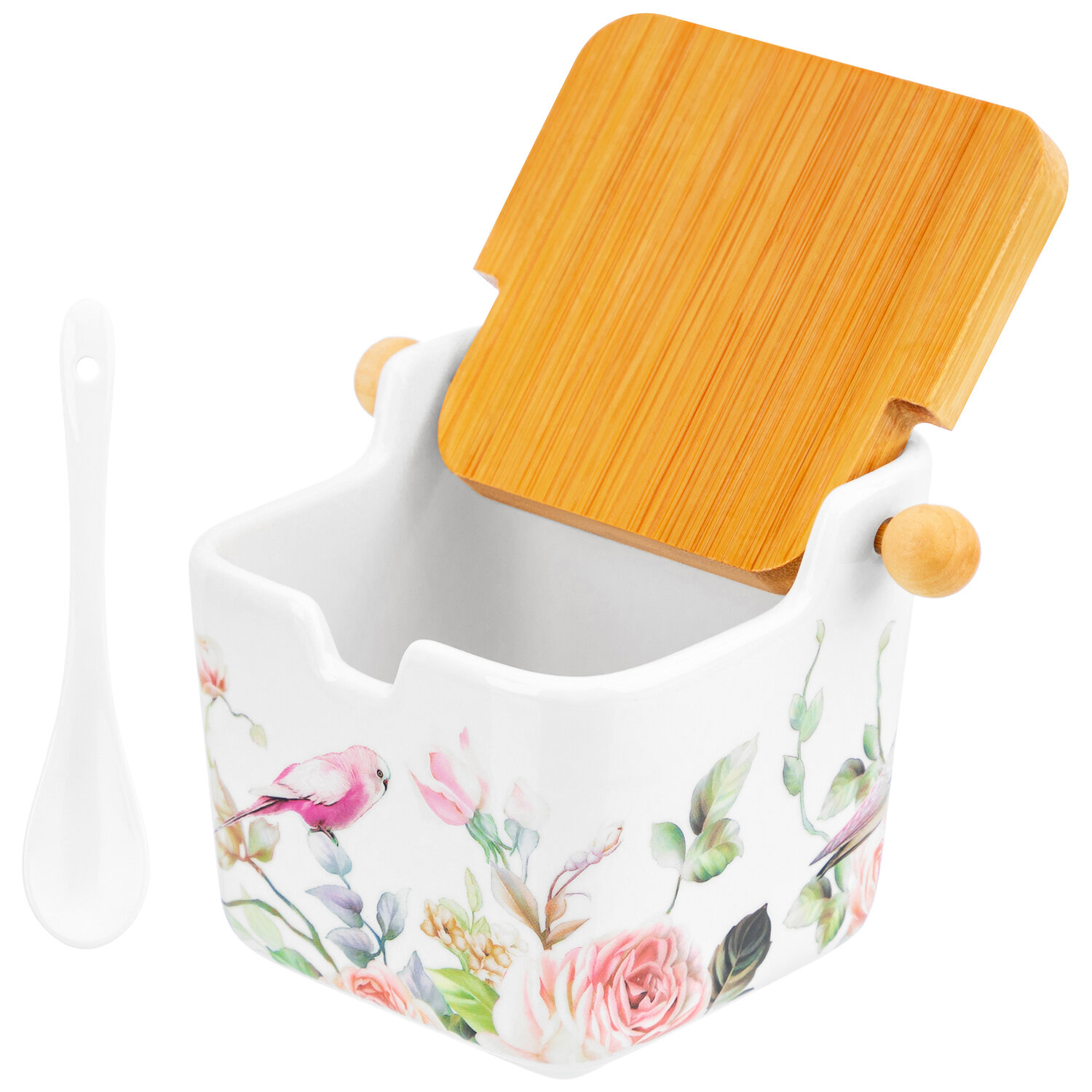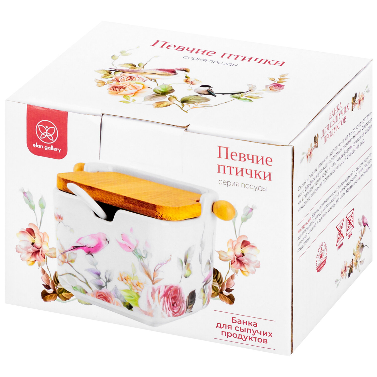 Купить Банка для хранения сыпучих продуктов, специй 250 мл Elan Gallery Певчие птички, с откидной бамбуковой крышкой, с ложкой