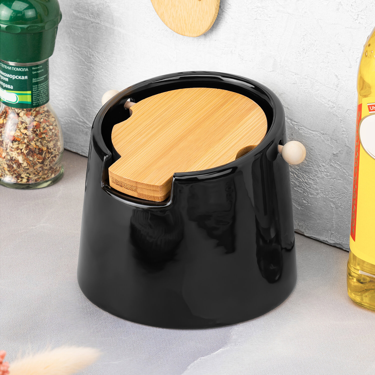 Банка для хранения сыпучих продуктов/ соли/ специй/ чая/ кофе 700 мл Elan Gallery Черная, с откидной бамбуковой крышкой интересное: