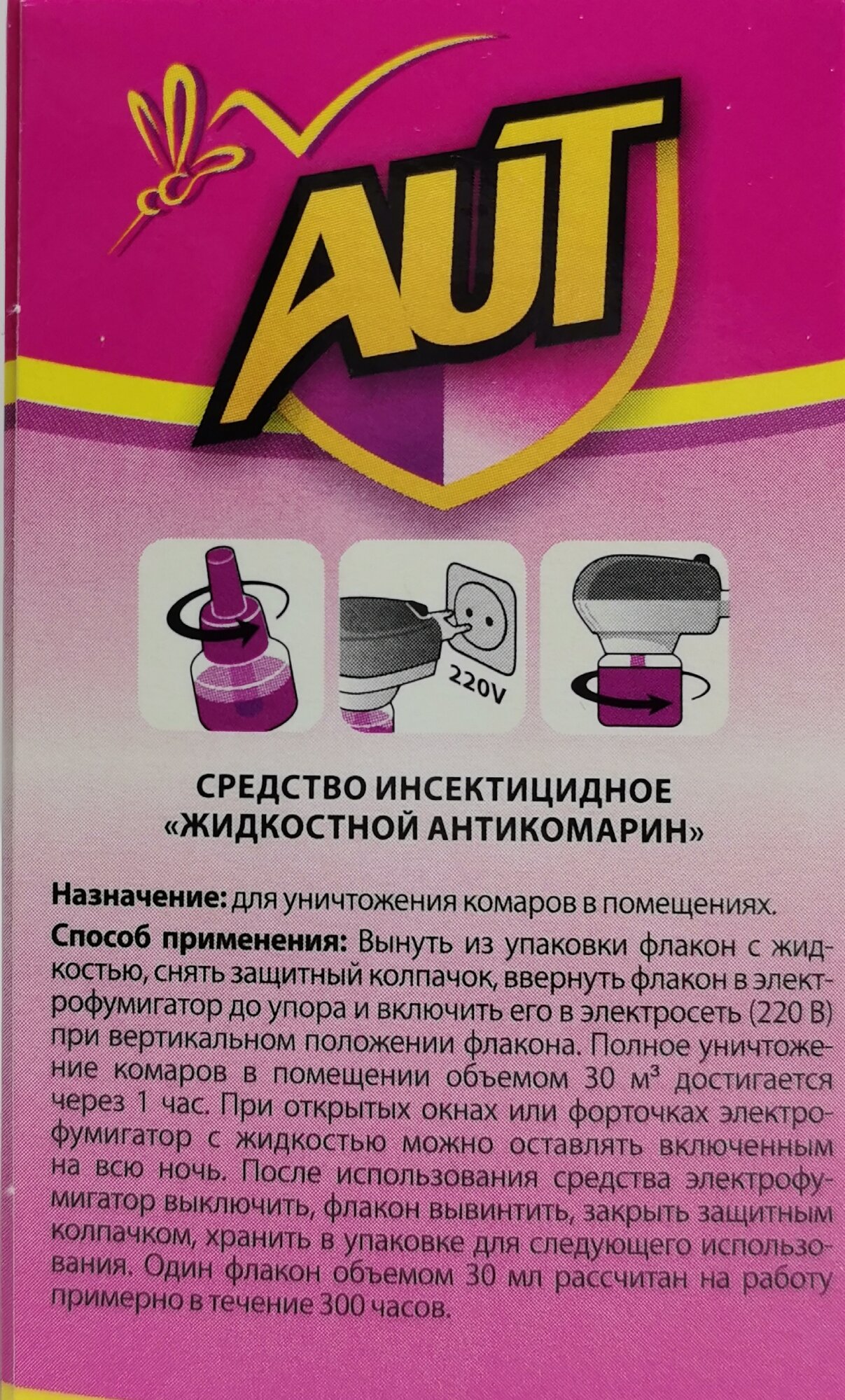 Жидкость для фумигаторов "АУТ", от мух, ос и комаров, 30 дней