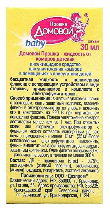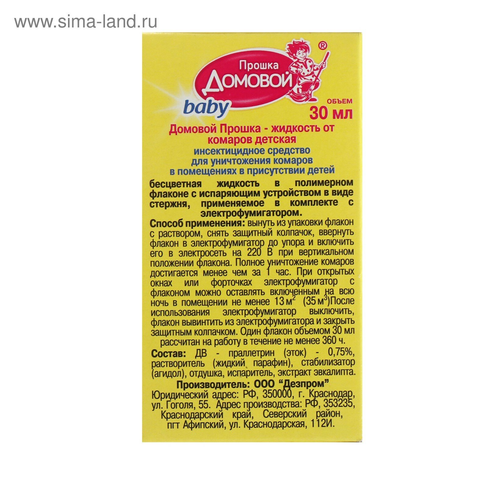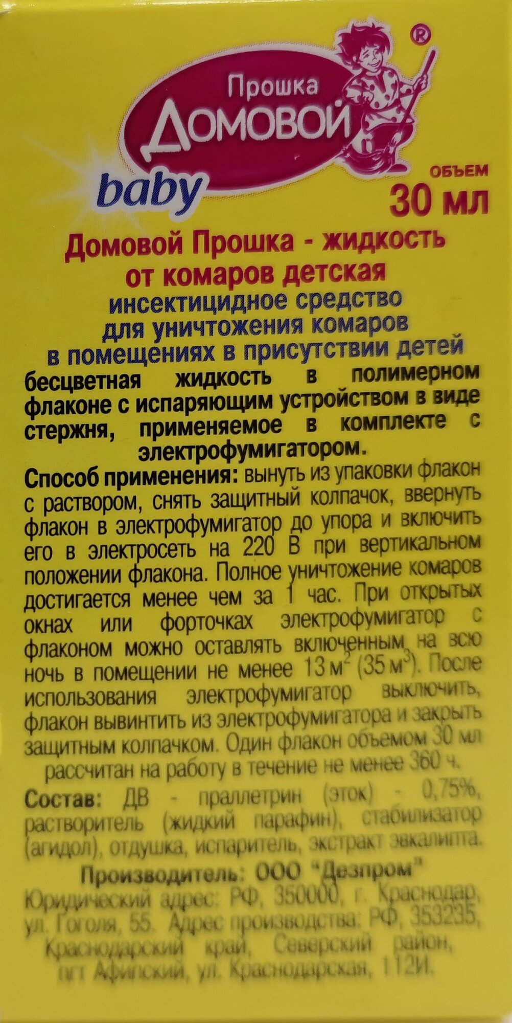 Жидкость для фумигатора Прошка Домовой "Детская", без запаха, уничтожение комаров, 30мл