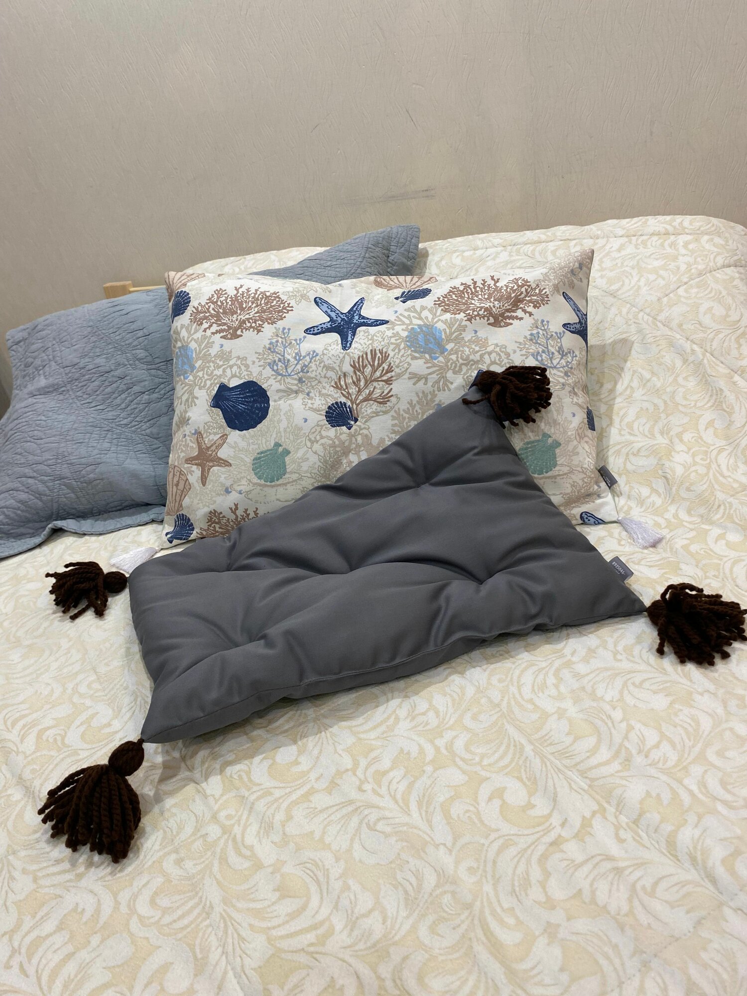 Подушка стёганая с синими кисточками, 50*35, MotPro.brothers, серая