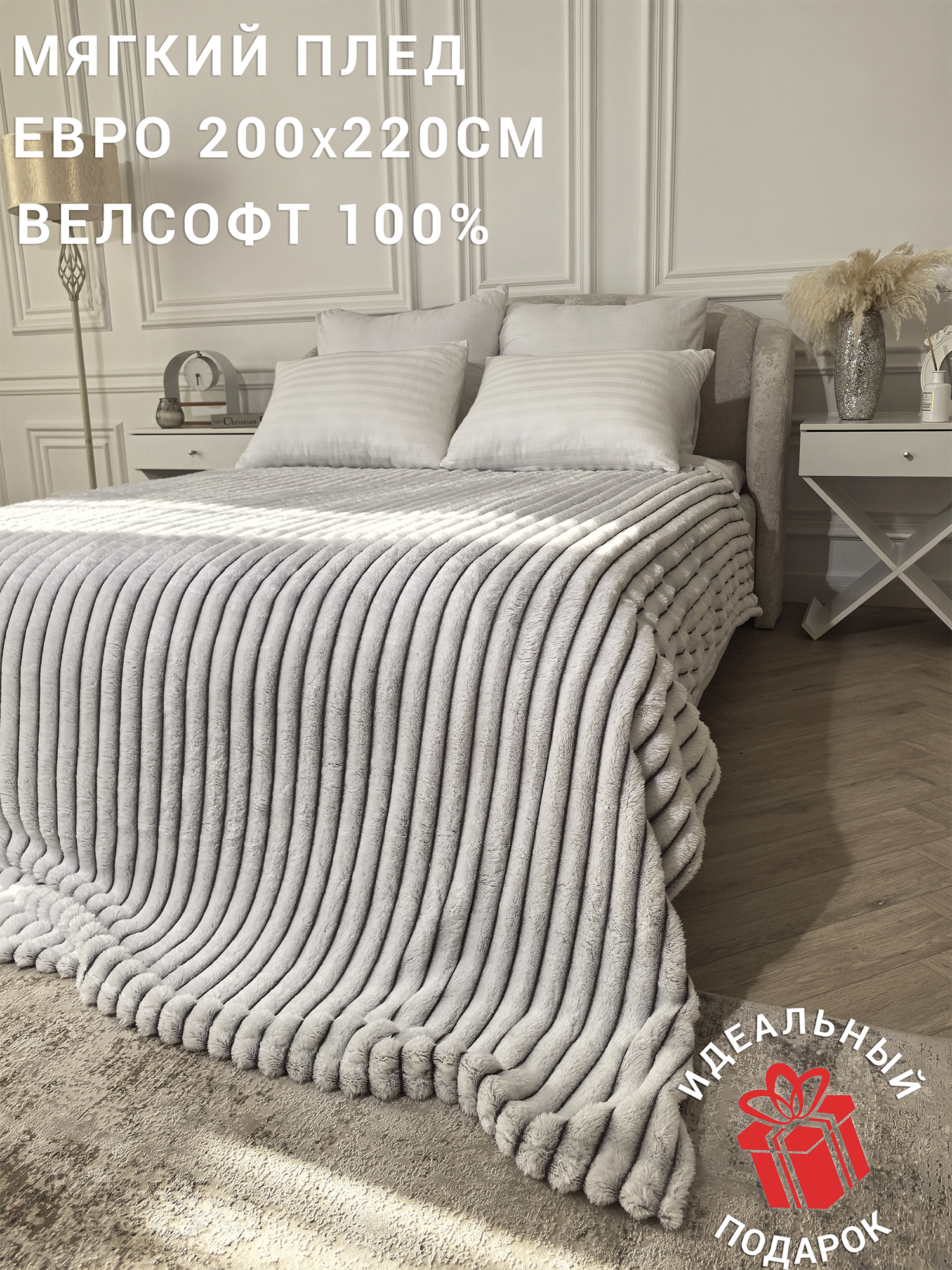 Плед-покрывало "серая гладь" евро, 200х220 см, велсофт 100% плотность 280 г/кв. м.