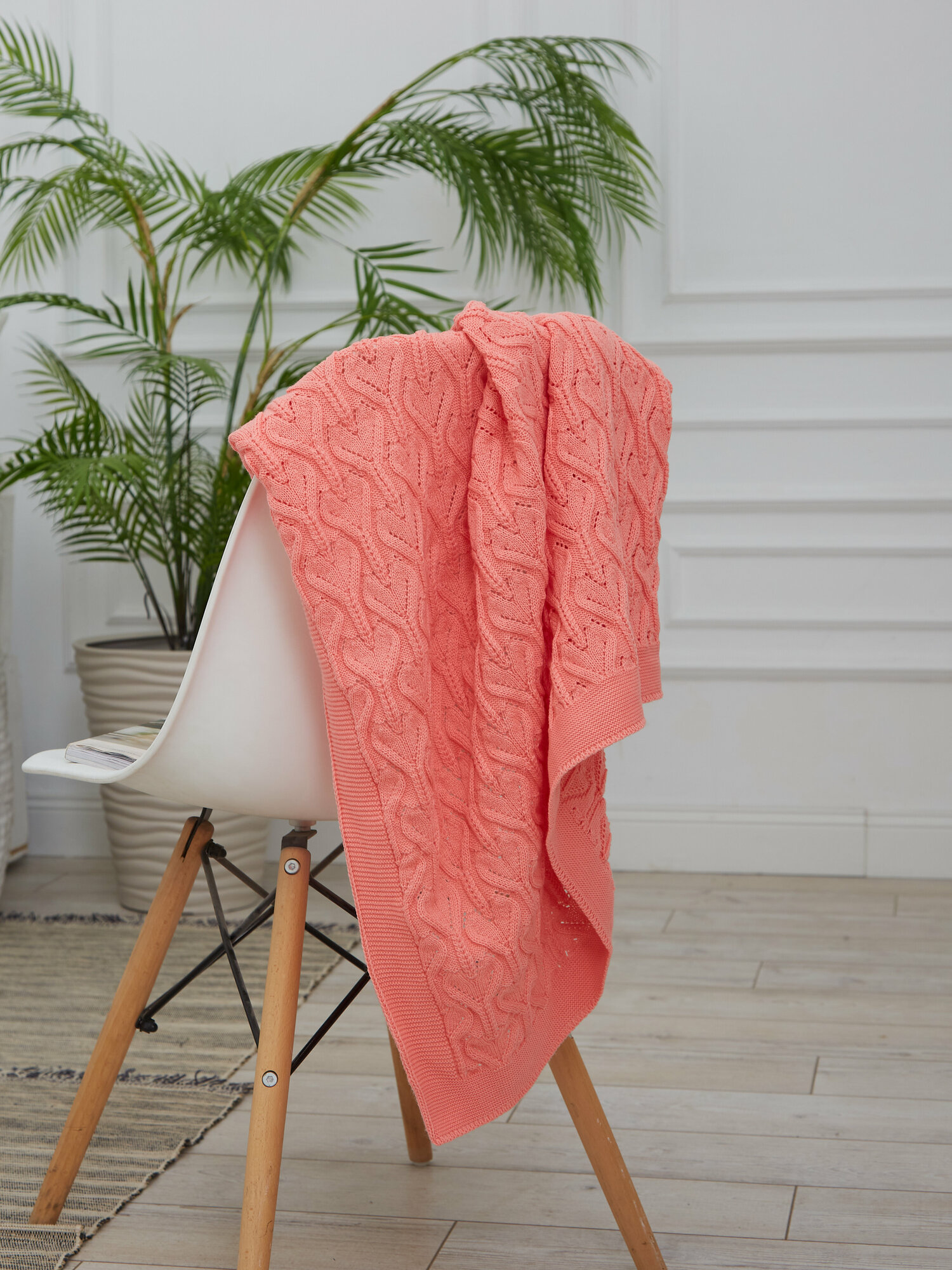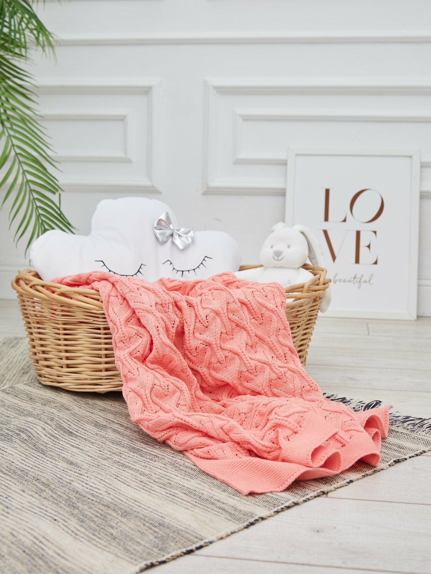 Купить Плед-покрывало вязаный хлопковый на односпальную кровать детский , покрывало вязаное AlmaForHome 90x160см / сердечки / коралловый