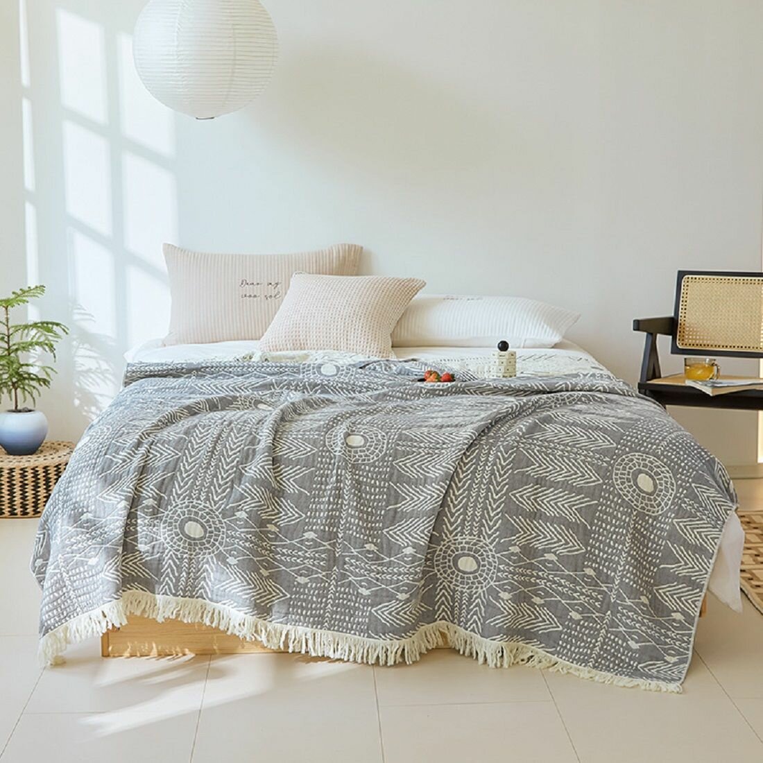 Плед - покрывало YENLN, муслин, 200x230 см, 100% хлопок, двухсторонний с бахромой
