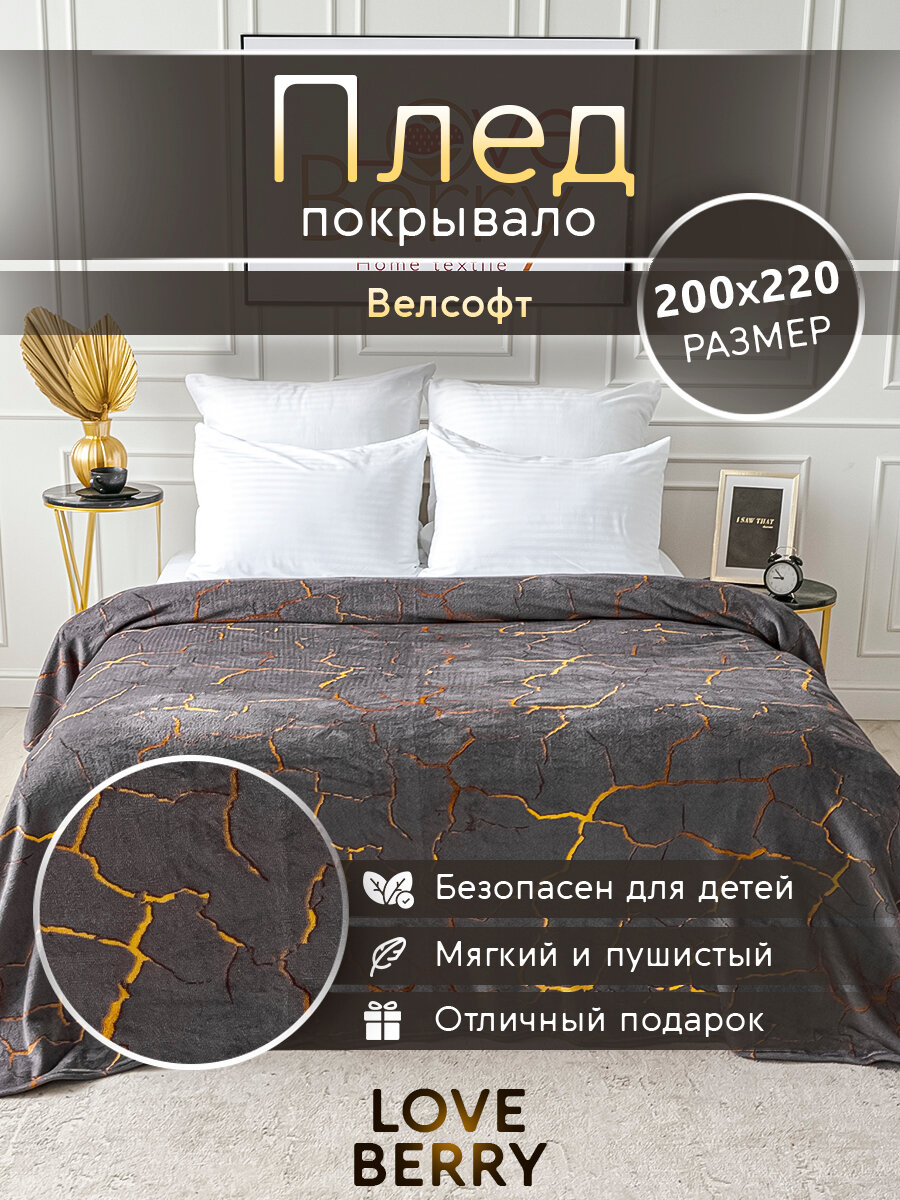 Плед 200х220 LOVEBERRY на кровать для спальни, из велсофта, 100% полиэстер, плюшевый