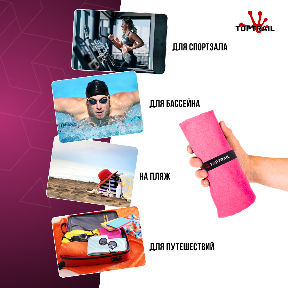 Полотенце спортивное TOPTRAIL, 40x60 см, розовое, из микрофибры, пляжное / для бассейна интересное: