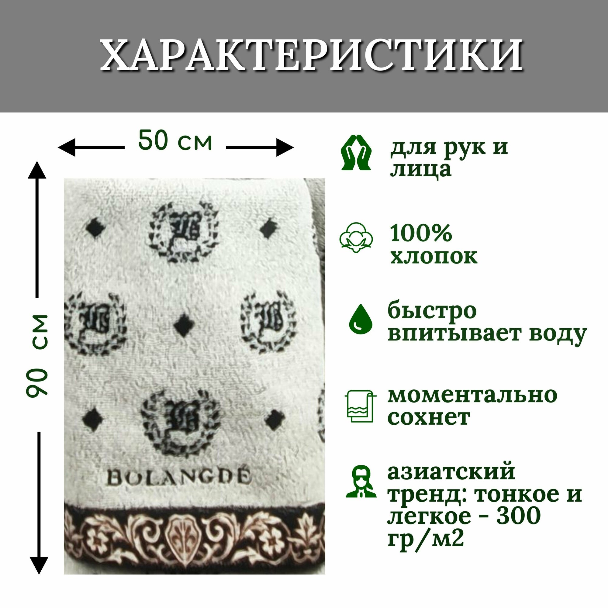 Купить Полотенце для ванной махровое, для лица и рук, велюровое BOLANGDE, 100% хлопок, Япония Лого 50х90, светло-серый 1 шт