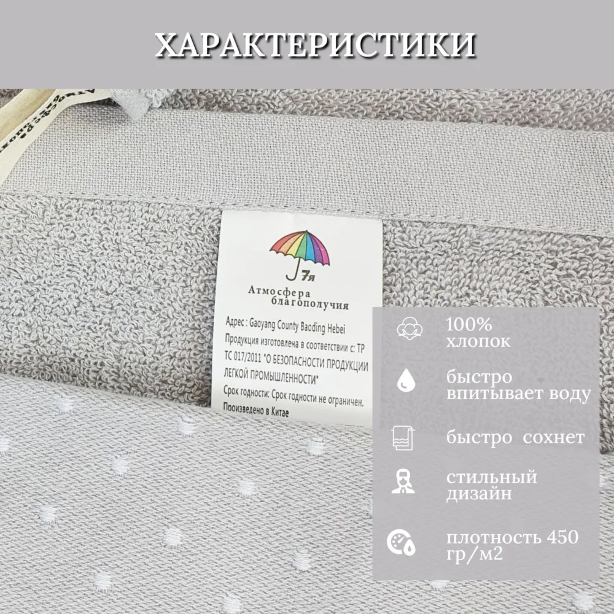 Полотенце банное для лица, рук махровое 50х90 см однотонное с бордюром в точечку, хлопок, 7Я текстиль, светло-серый