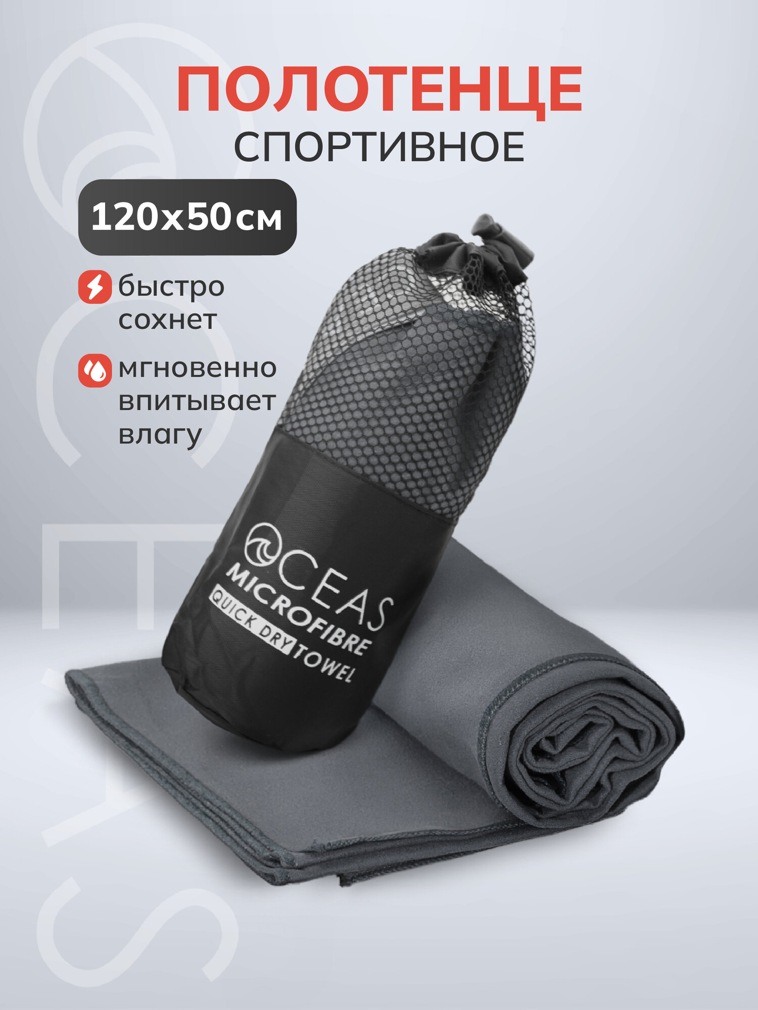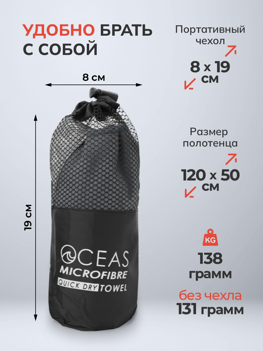 Купить Спортивное полотенце OCEAS быстросохнущее из микрофибры, для зала и басейна, 120х50 см, тёмно-серый