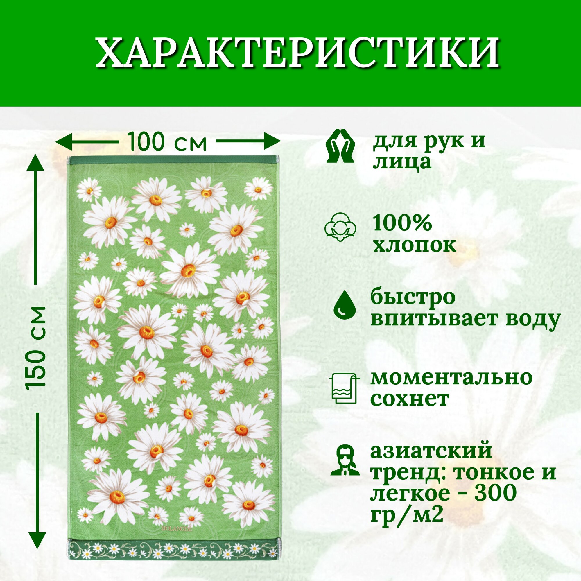 СохранитьПолотенце банное махровое для ванны, для сауны, для детей и взрослых, для семьи BOLANGDE Япония Ромашки, зеленый, размер 100х150 интересное:
