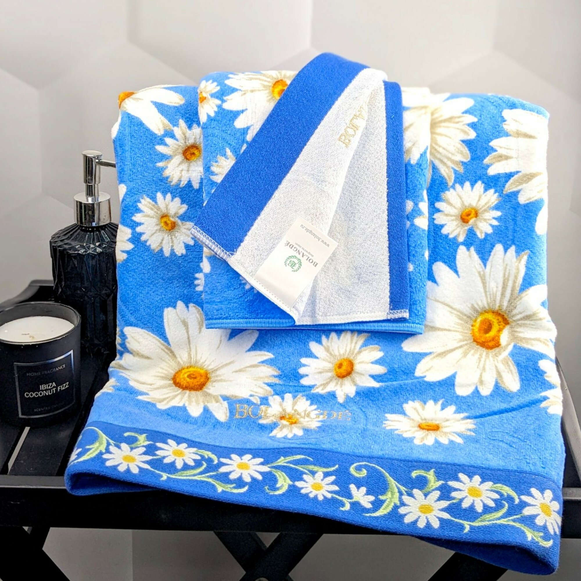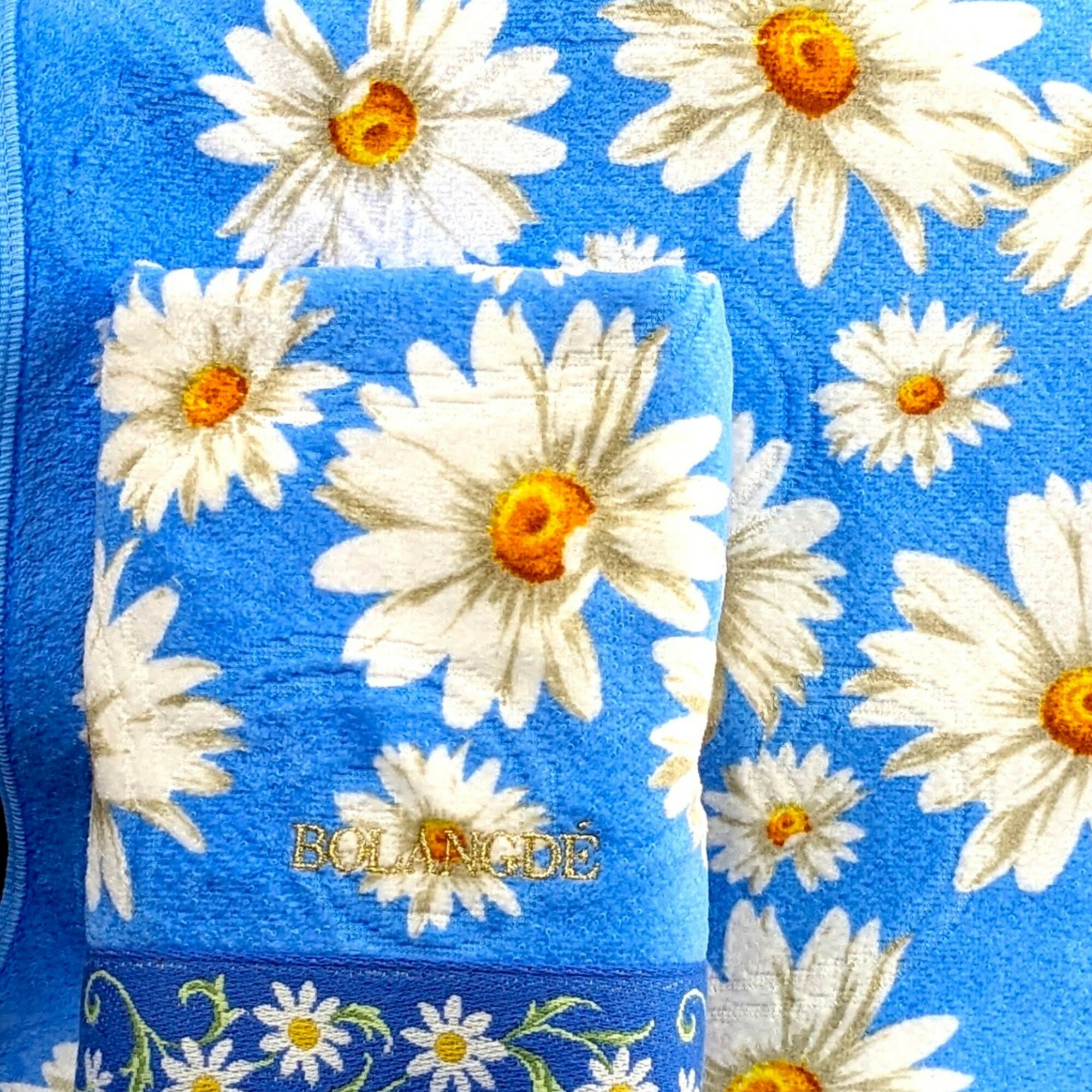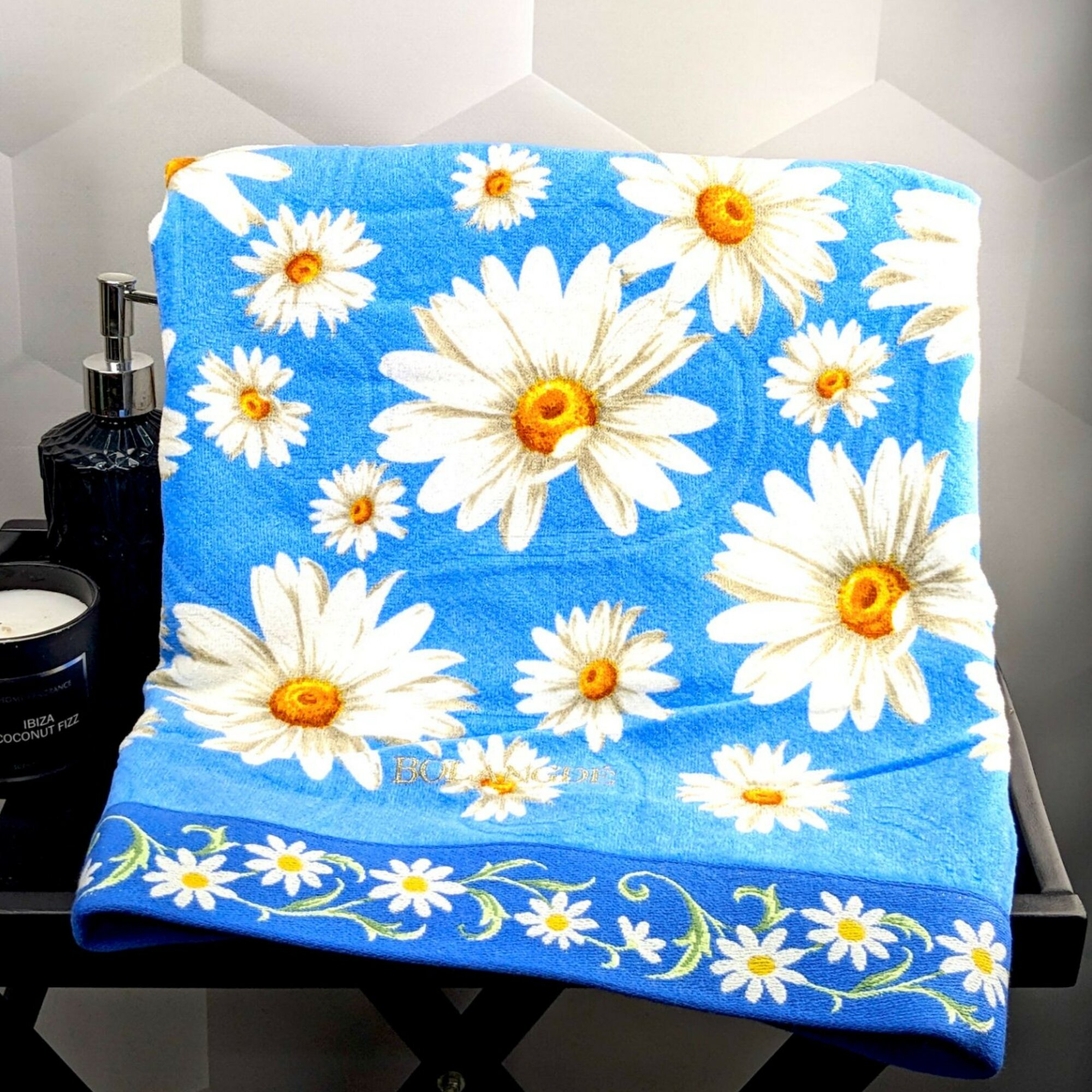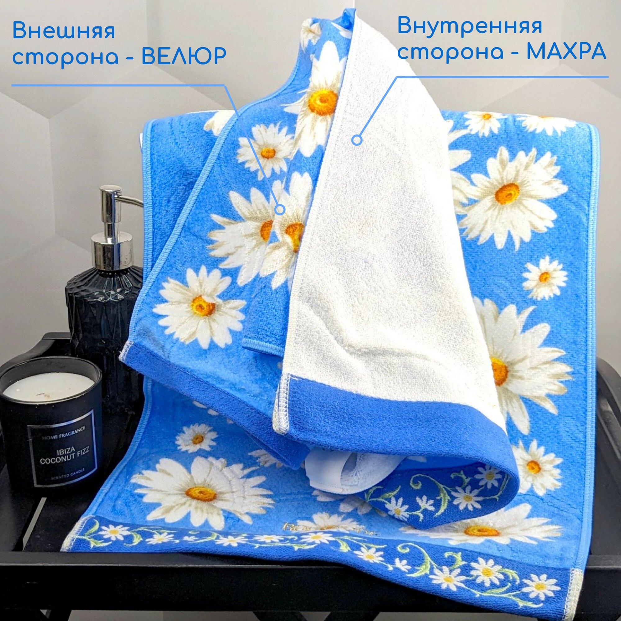 Полотенце для ванной махровое банное большое, велюровое BOLANGDE, 100% хлопок, рисунок цветы, Япония Ромашки 70х140, синий 1 шт