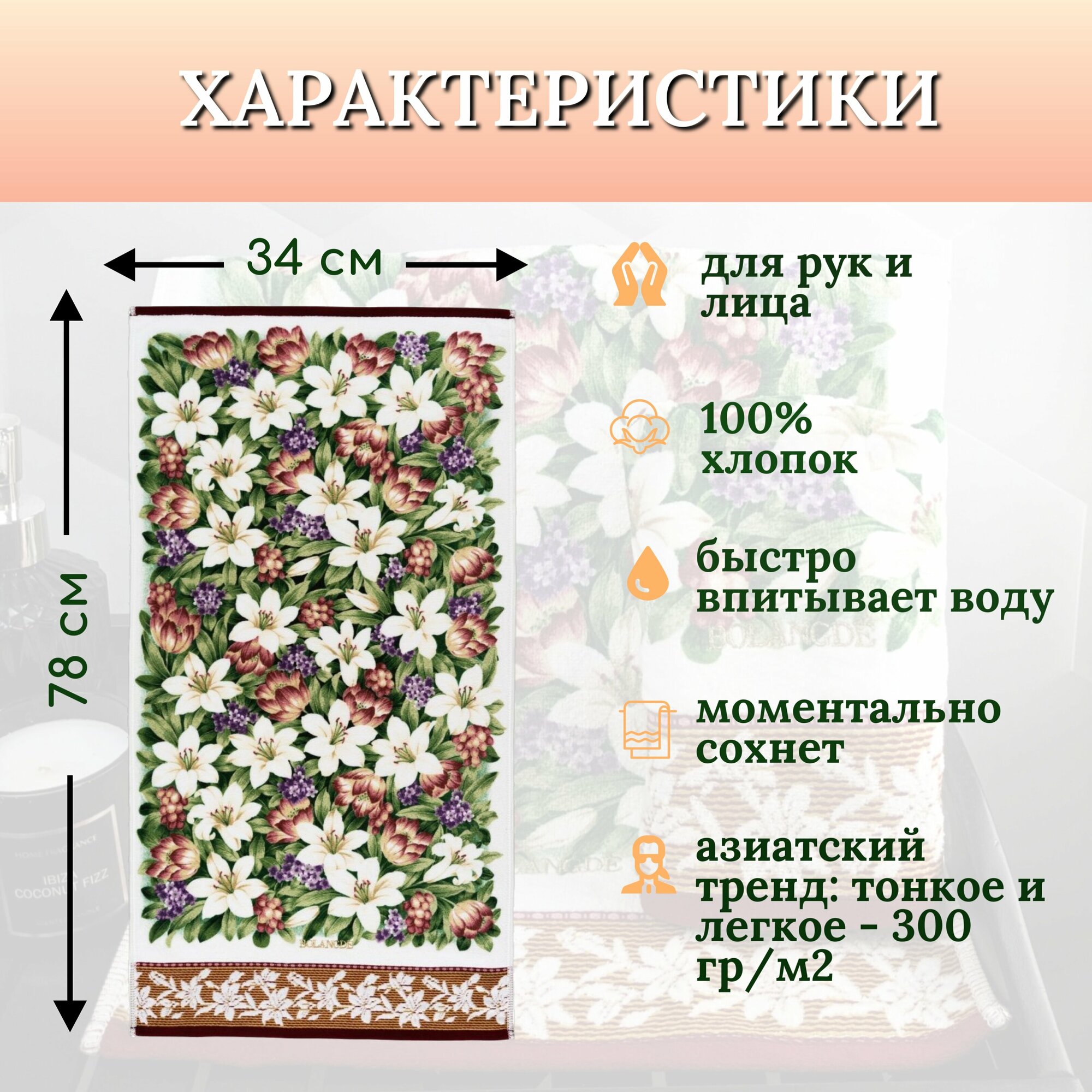 Махровое полотенце из 1 шт. 34х78 для лица/рук, хлопок 100%, лилия, Япония 2019А-34х78-белый/зеленый