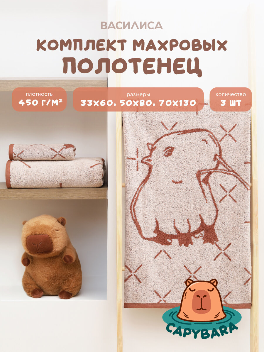 Набор махровых полотенец Василиса 33х60, 50х80, 70х130, 3шт, Капибара интересное: