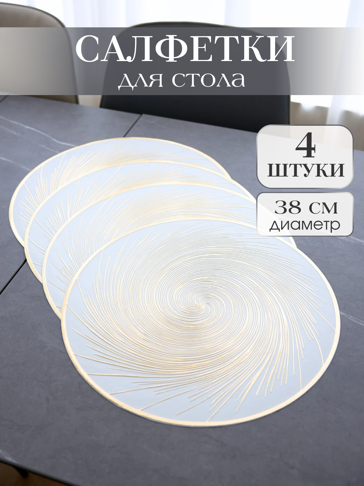 Набор сервировочных салфеток для стола 4 штуки белые с серебром D38см