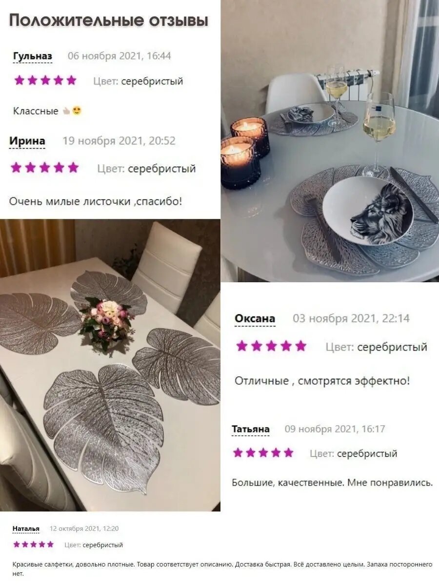 Ниже Вы можете прочитать отзывы на Сервировочные салфетки AROMAFLOW "Лист монстеры", ПВХ, 38 см, 4 шт, серебристые, ознакомится с подробными характеристиками, посмотреть интересные обзоры и фотографии на Сервировочные салфетки AROMAFLOW "Лист монстеры", ПВХ, 38 см, 4 шт, серебристые.