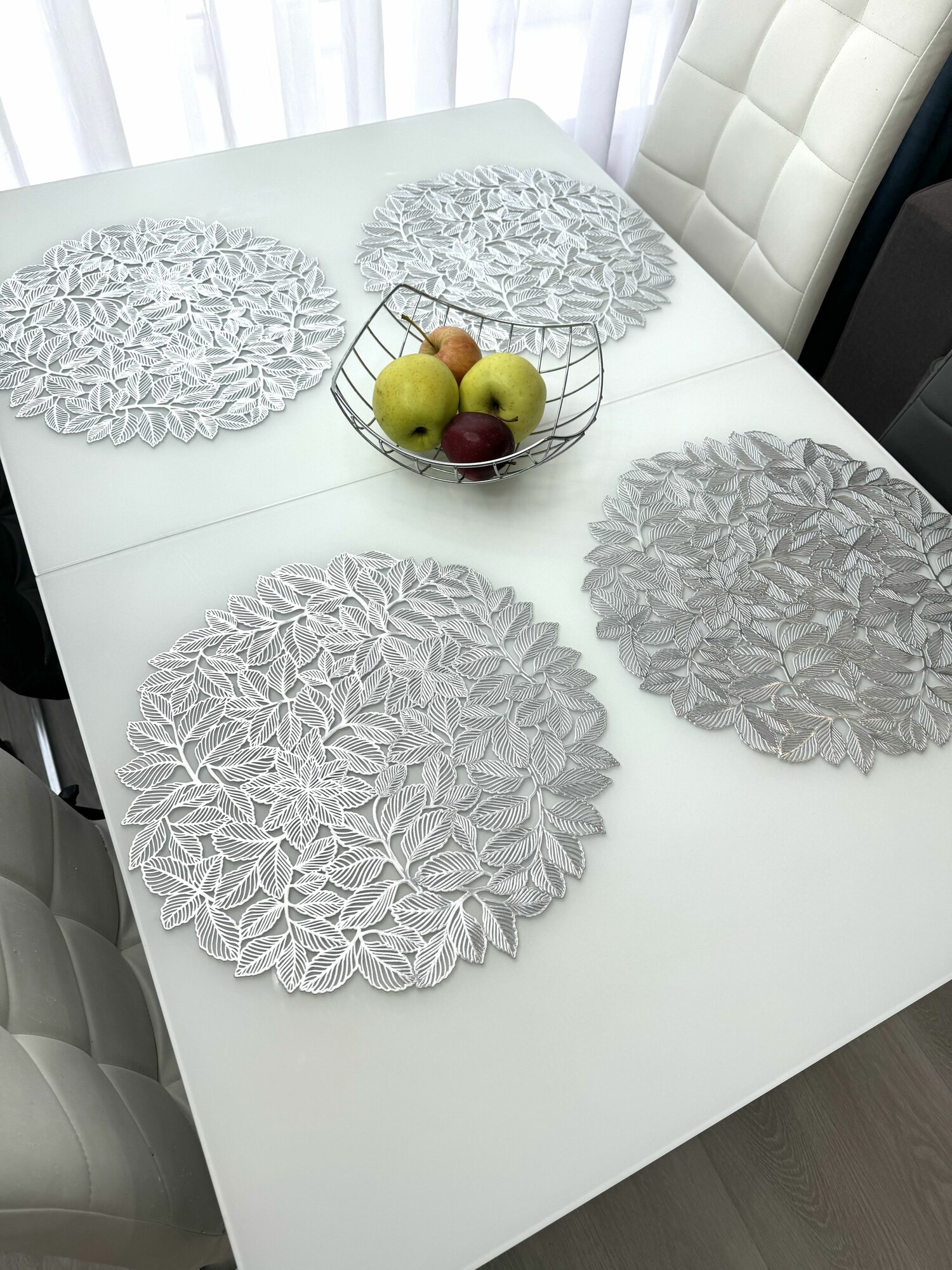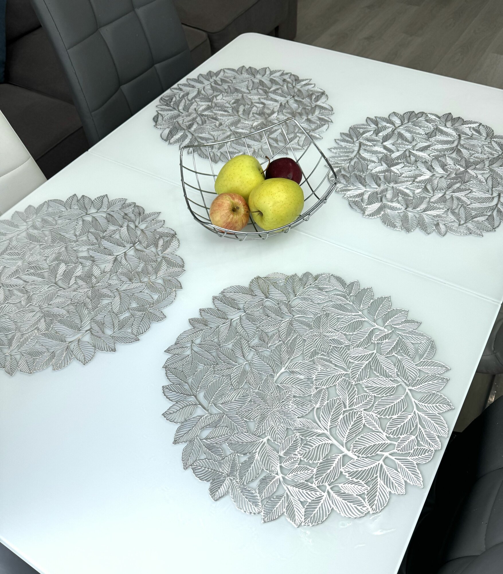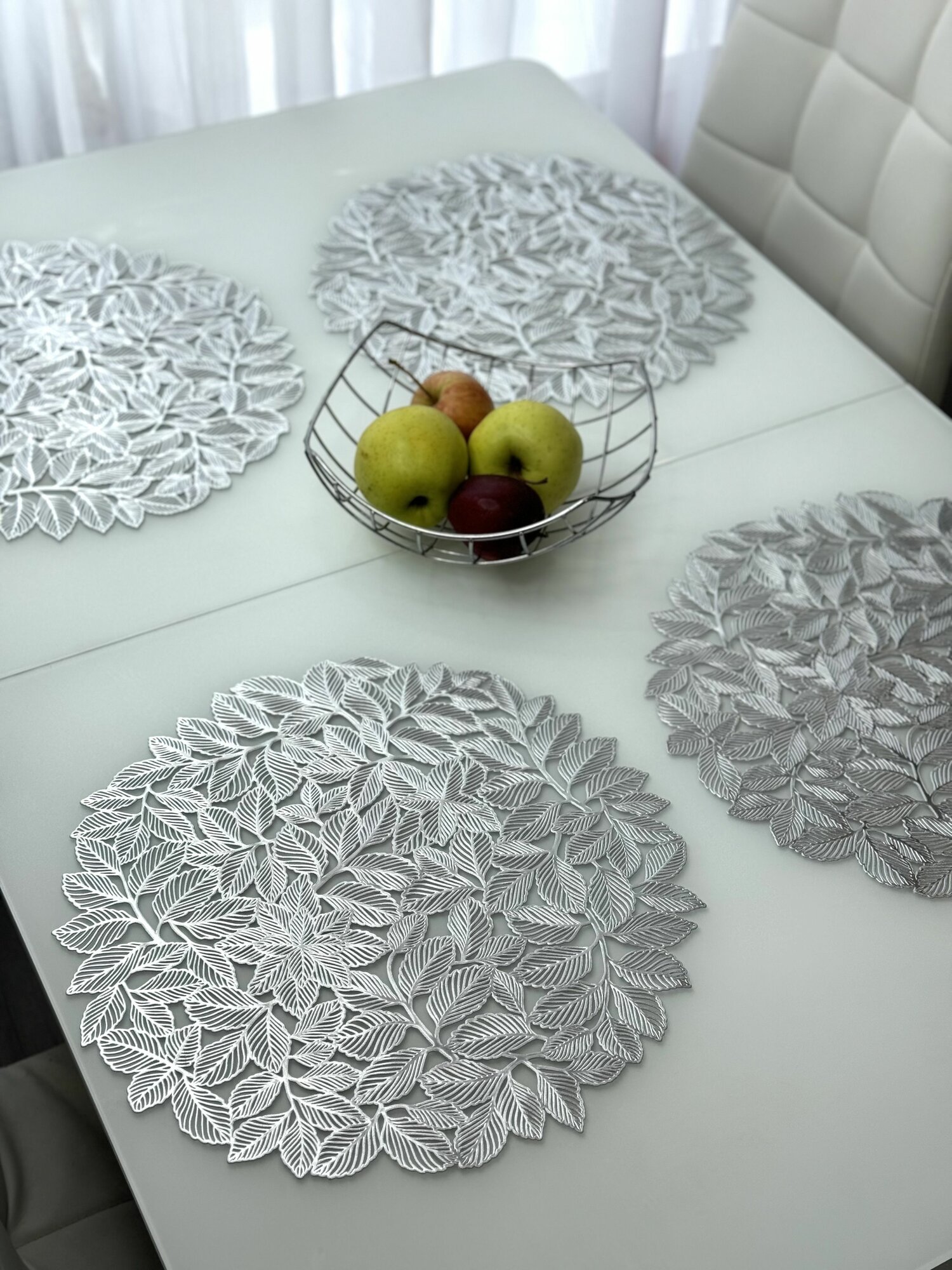 СохранитьСалфетки для сервировки стола Листья мяты серебро, 4 шт, круглые, диаметр 38 см. Подставка под тарелки сервировочные из ПВХ. Набор плейсматов интересное: