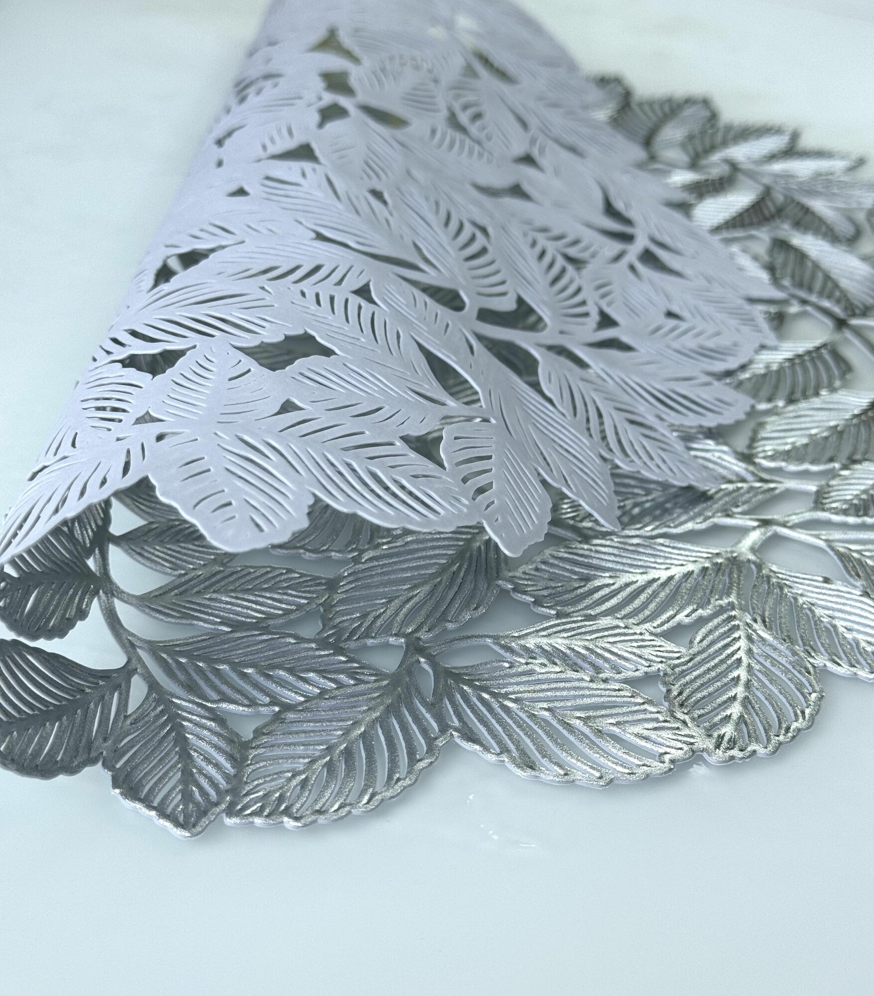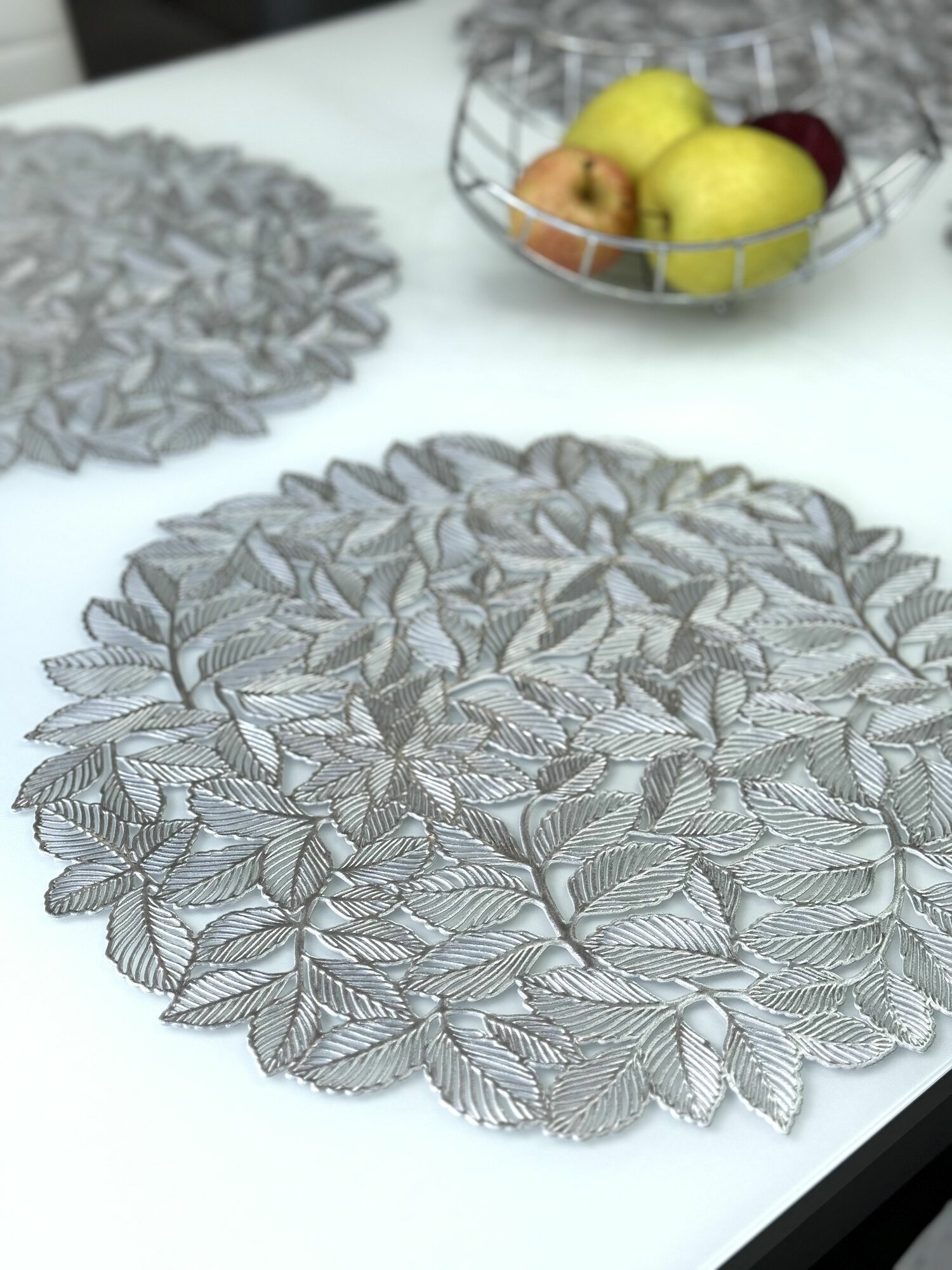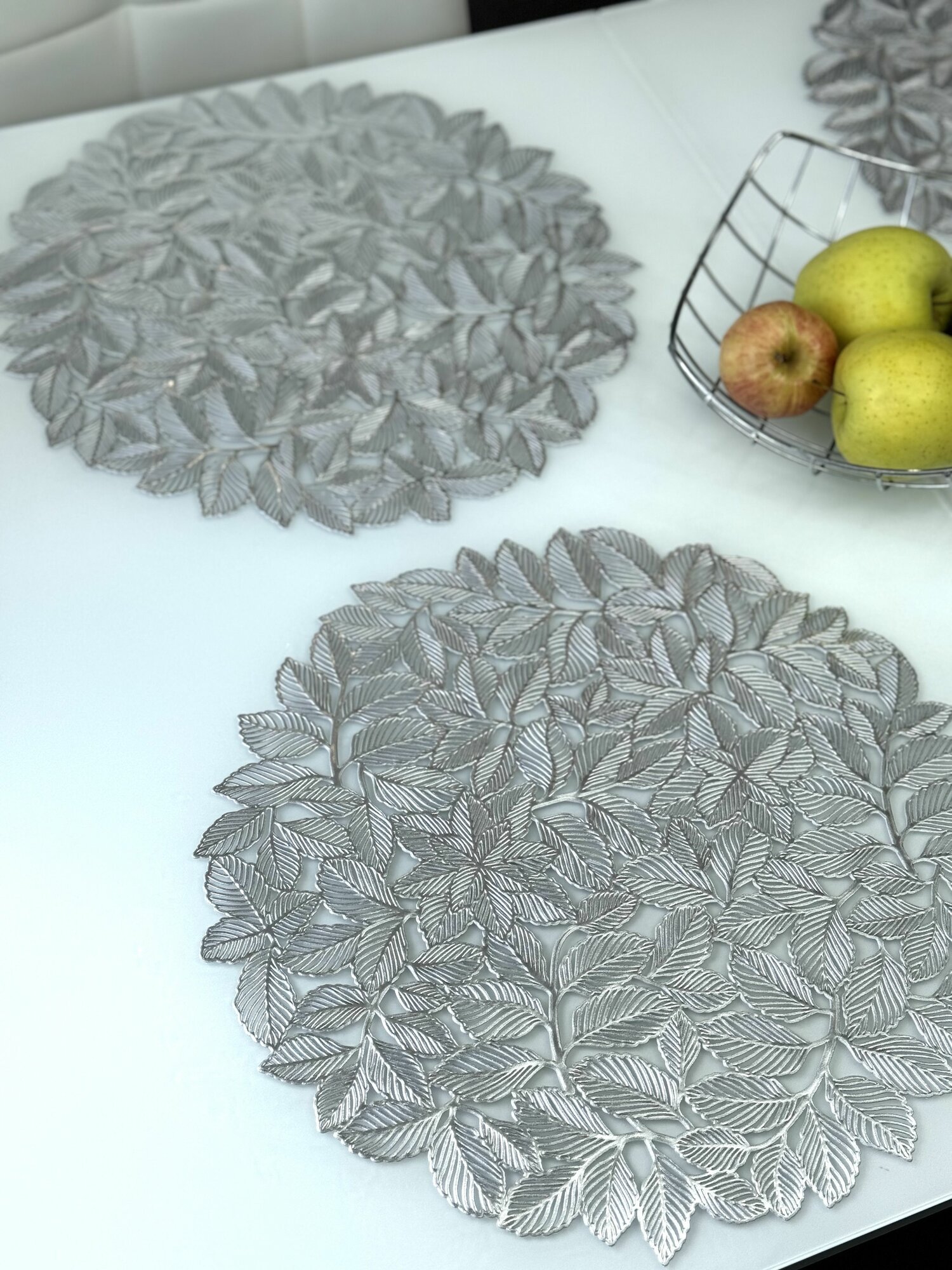 СохранитьСалфетки для сервировки стола Листья мяты серебро, 4 шт, круглые, диаметр 38 см. Подставка под тарелки сервировочные из ПВХ. Набор плейсматов интересное: