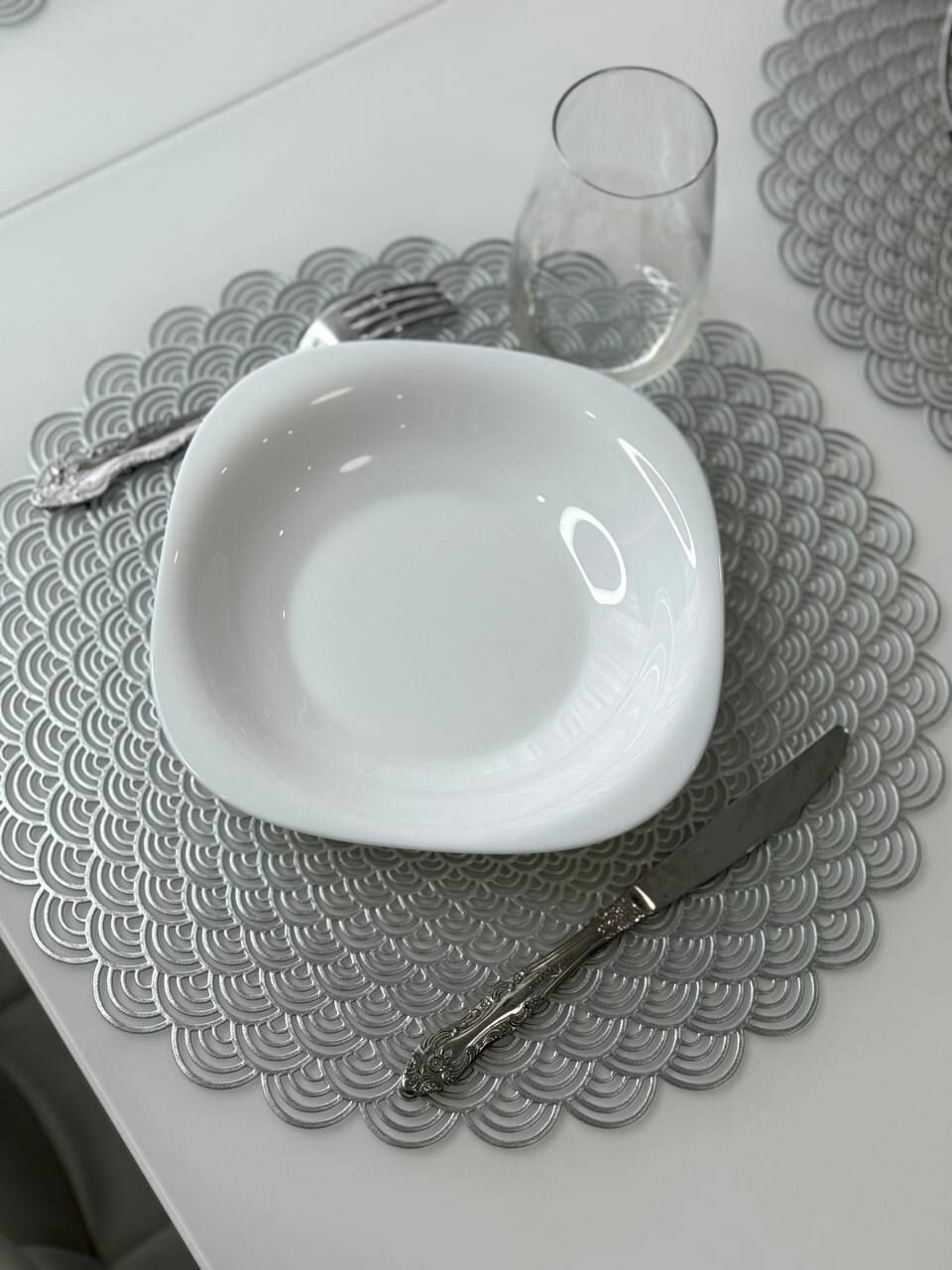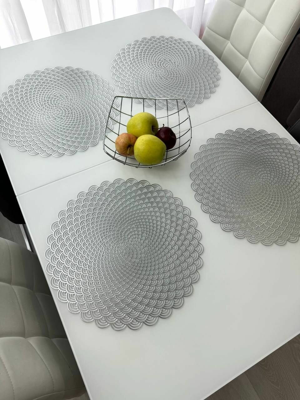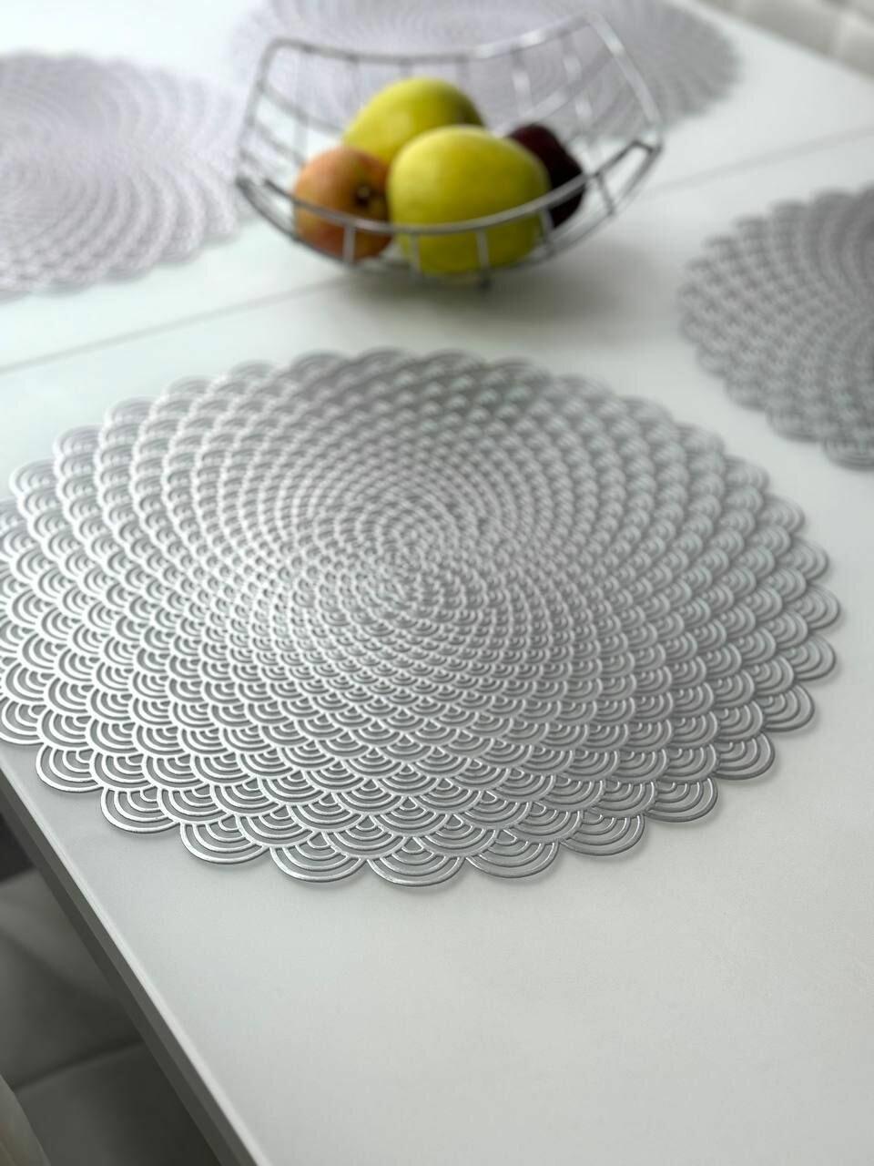 СохранитьСалфетки для сервировки стола Чешуйки серебро, 4 шт, круглые, диаметр 38 см. Подставка под тарелки сервировочные из ПВХ. Набор плейсматов интересное: