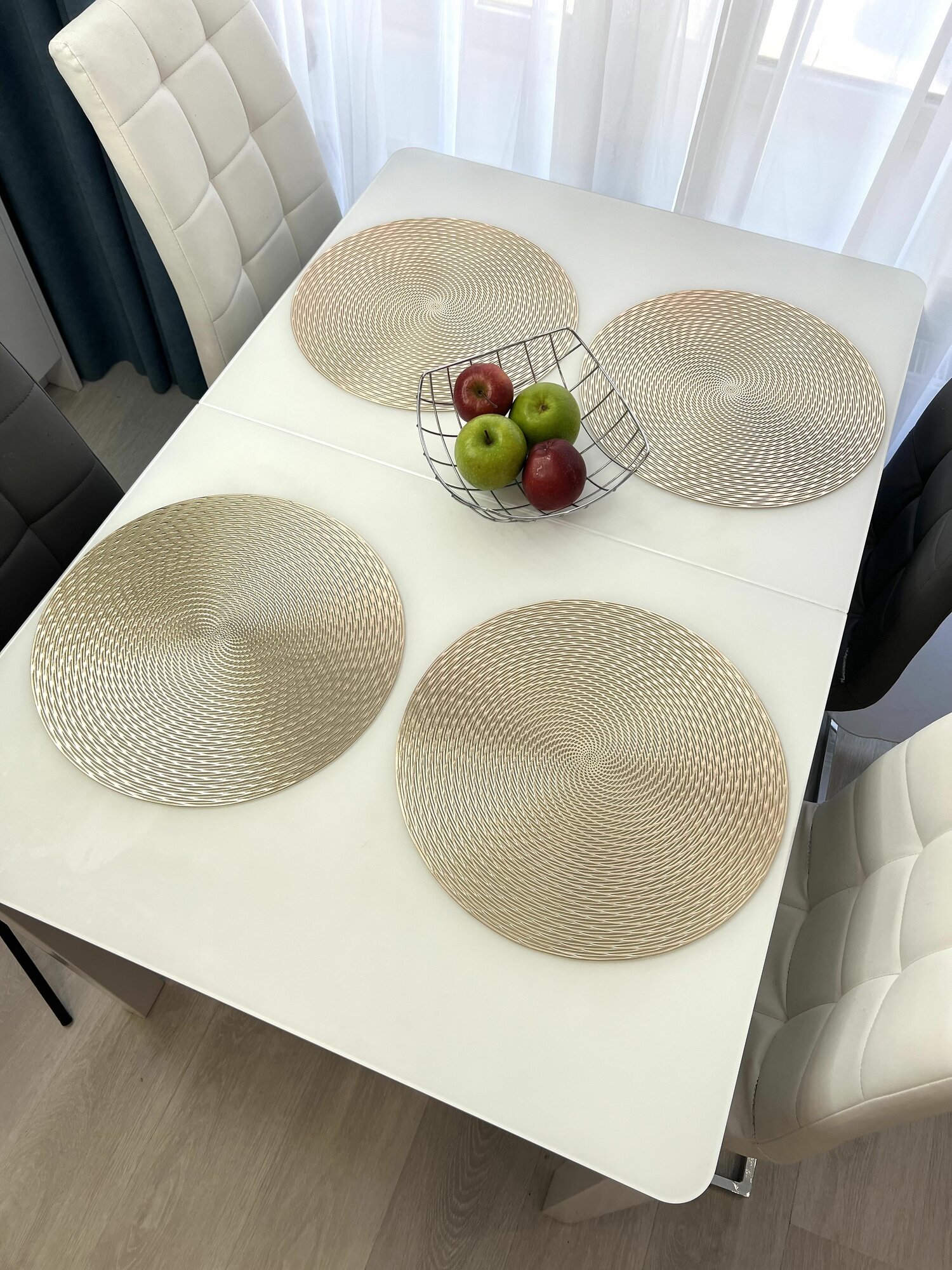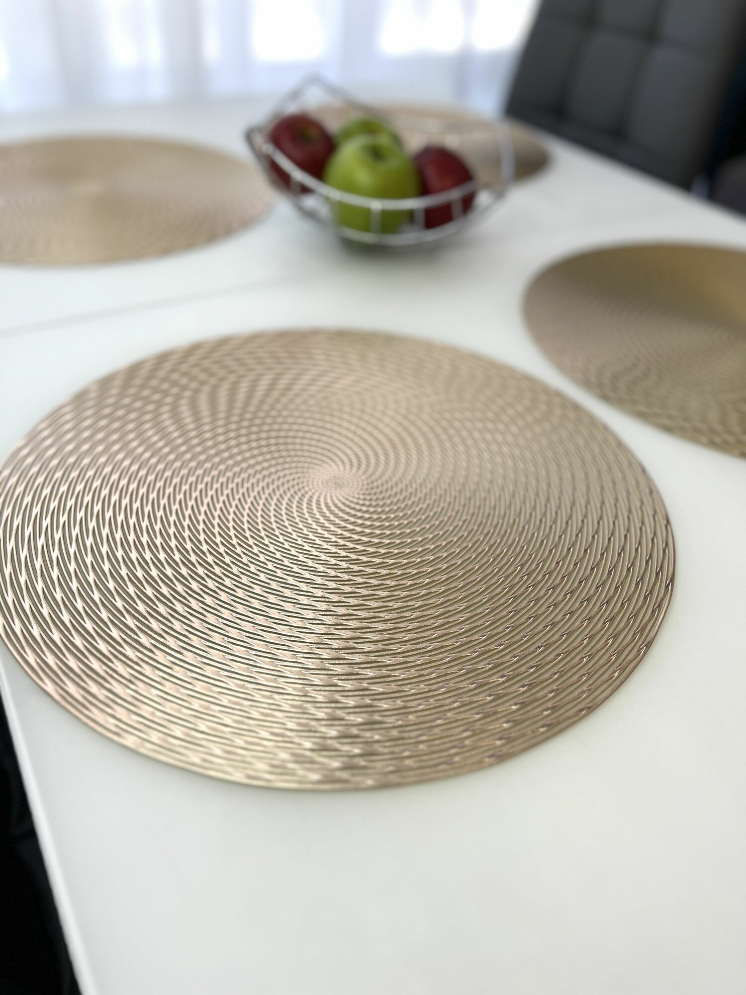 СохранитьСалфетки для сервировки стола Спираль золото, 4 шт, круглые, диаметр 38 см. Подставка под тарелки сервировочные из ПВХ. Набор плейсматов интересное: