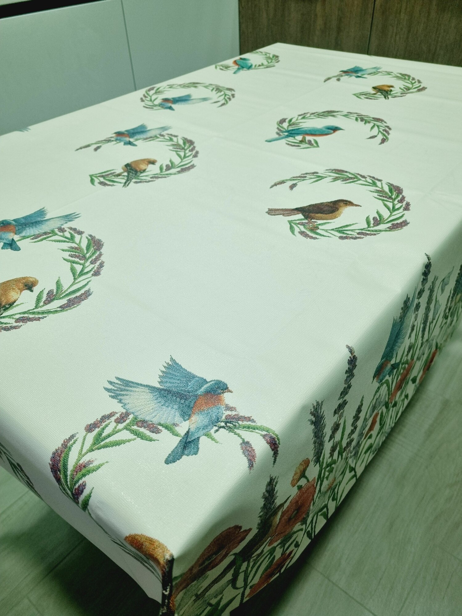 Клеенка-скатерть с тефлоновым покрытием с рисунком птички интересное: