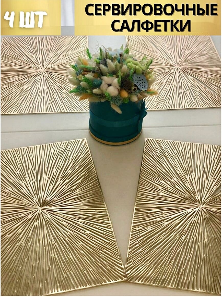 СохранитьСалфетки для сервировки стола Паутинка золото, 4 шт, прямоугольные 35*40 см. Подставка под тарелки сервировочные из ПВХ. Набор плейсматов интересное:
