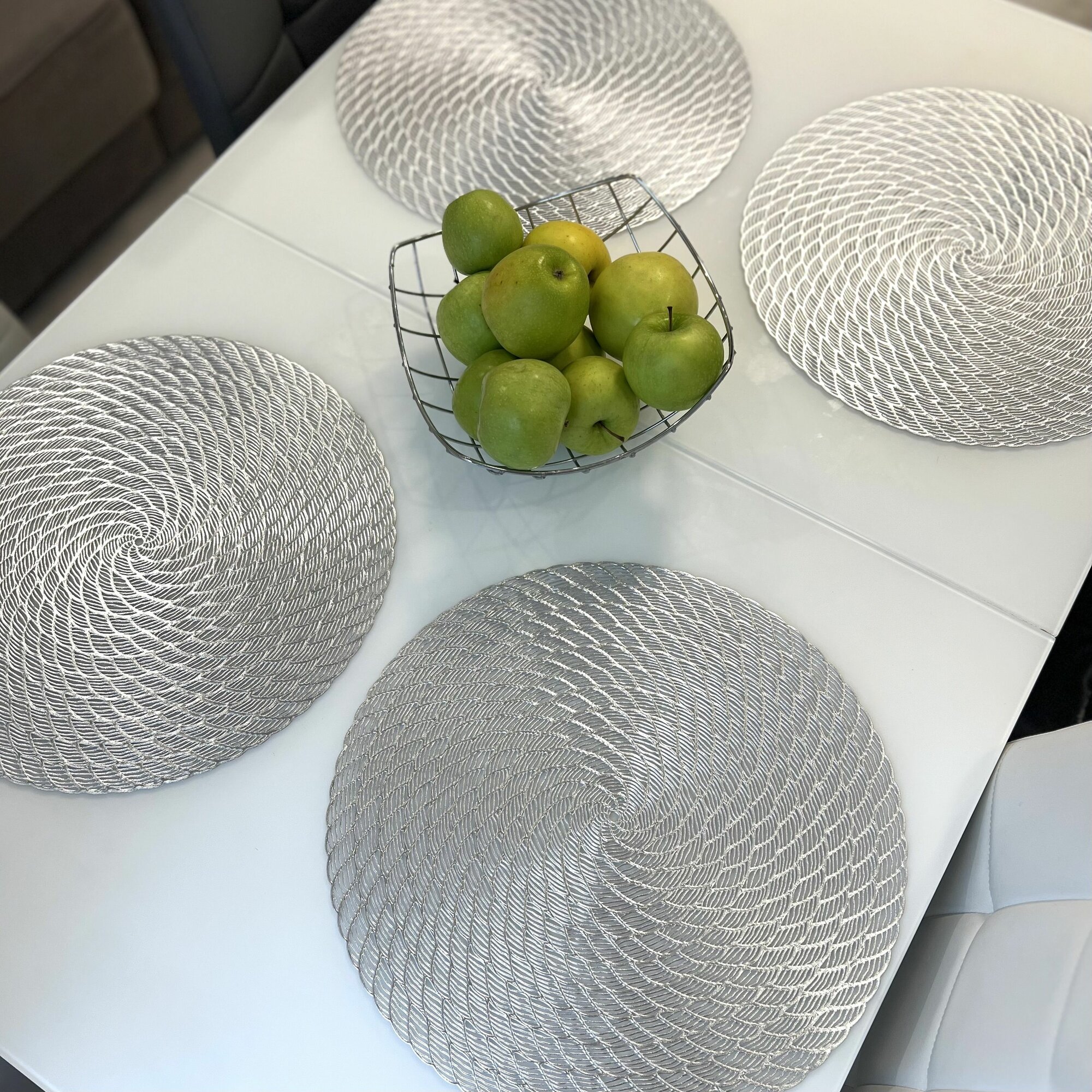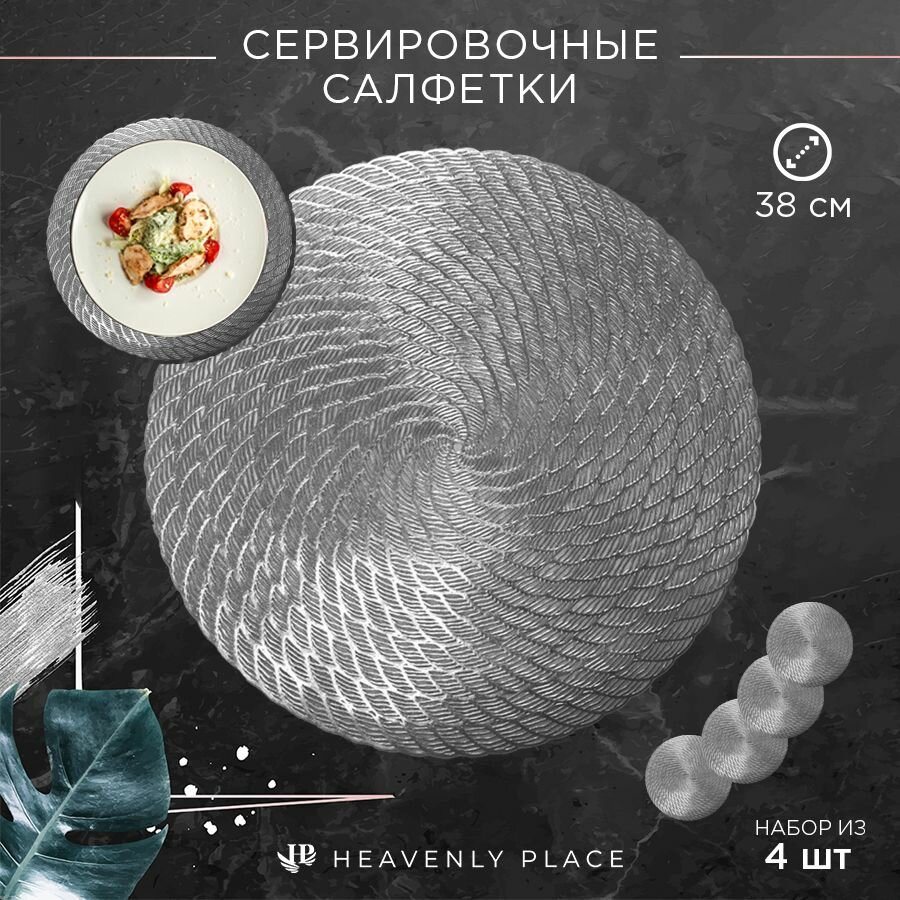 Салфетки для сервировки стола серебро, 4 шт, круглые, диаметр 38 см. Подставка под тарелки сервировочные из ПВХ. Набор плейсматов