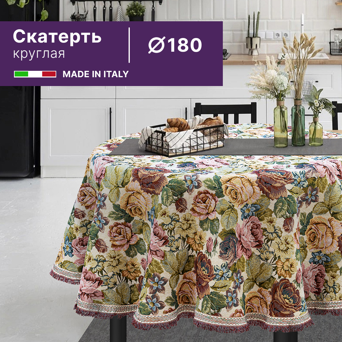 Купить Круглая гобеленовая скатерть 180 см (Италия) с крупными цветами