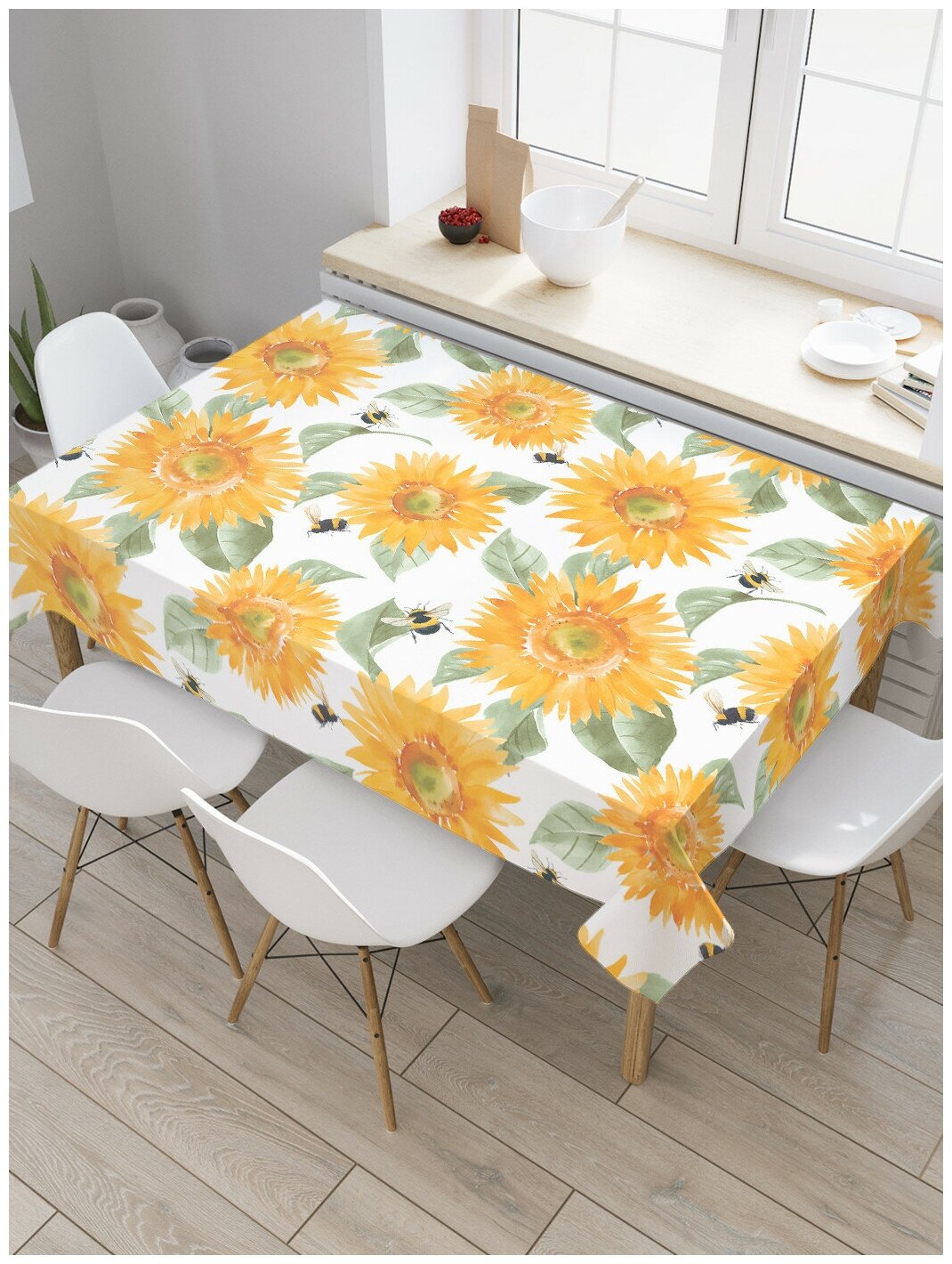 Купить Прямоугольная тканевая скатерть на стол с рисунком "Подсолнух и шмель" 120 на 145 см, JoyArty, серия 8 марта