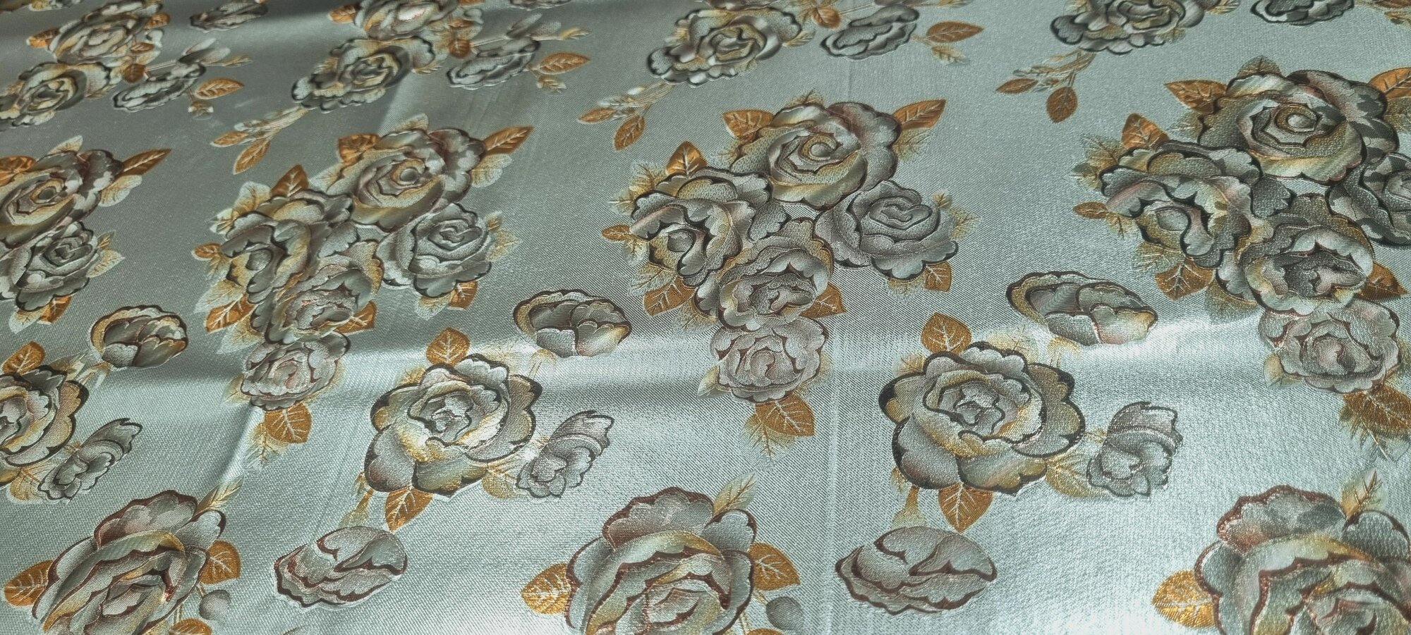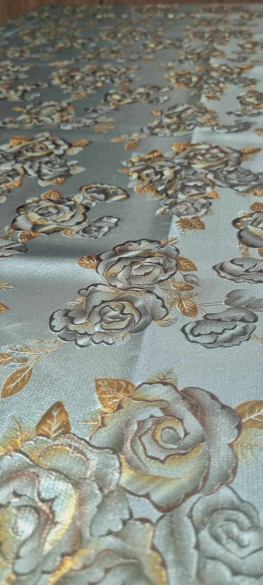 Клеенка-скатерть на стол серебряный фон с золотыми и красными цветами 220х140