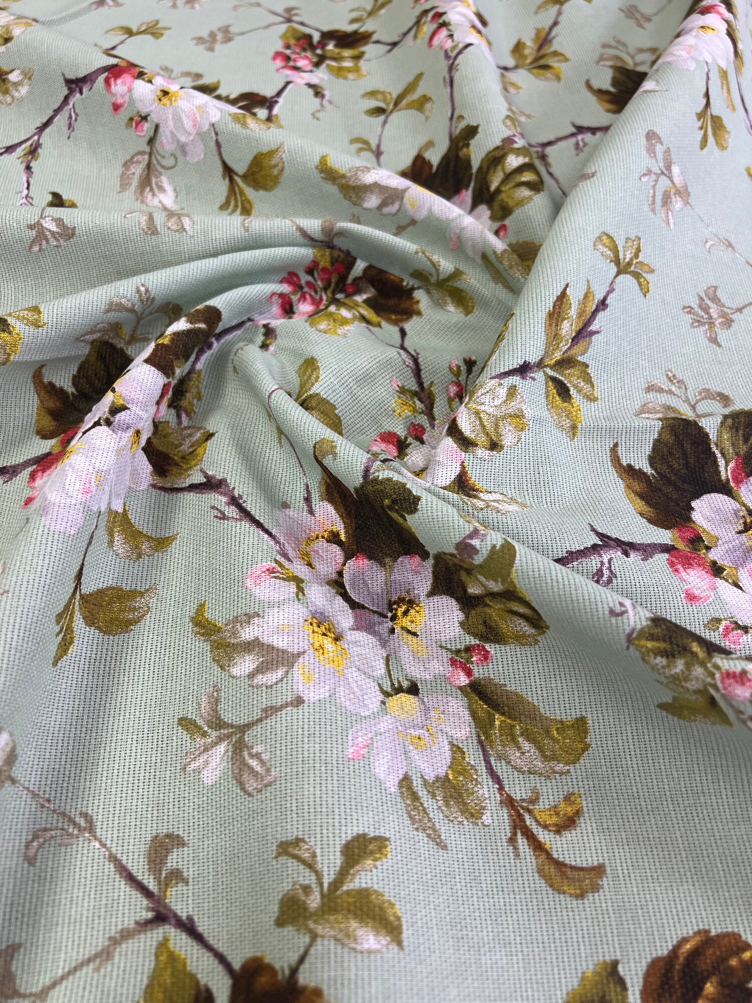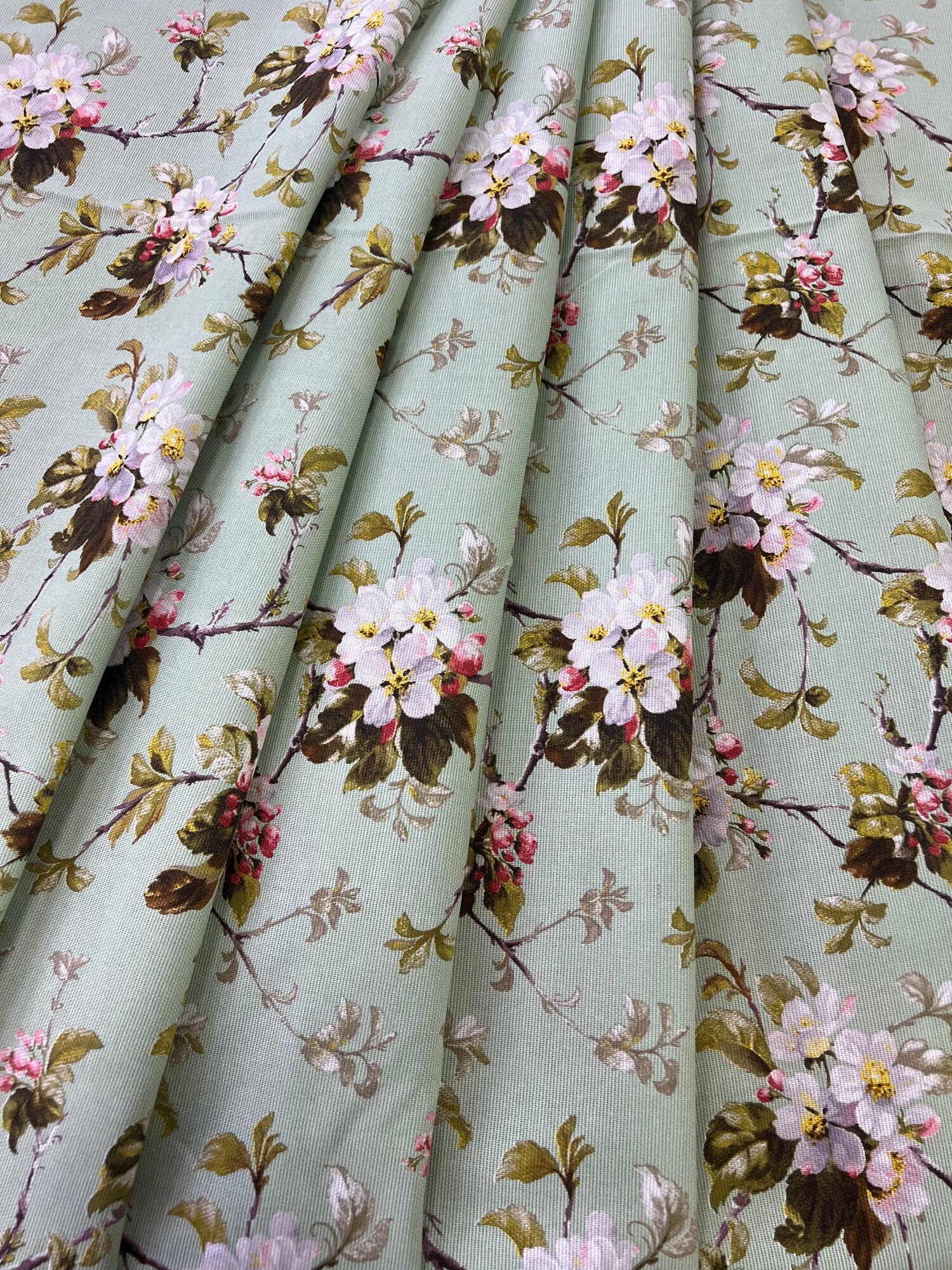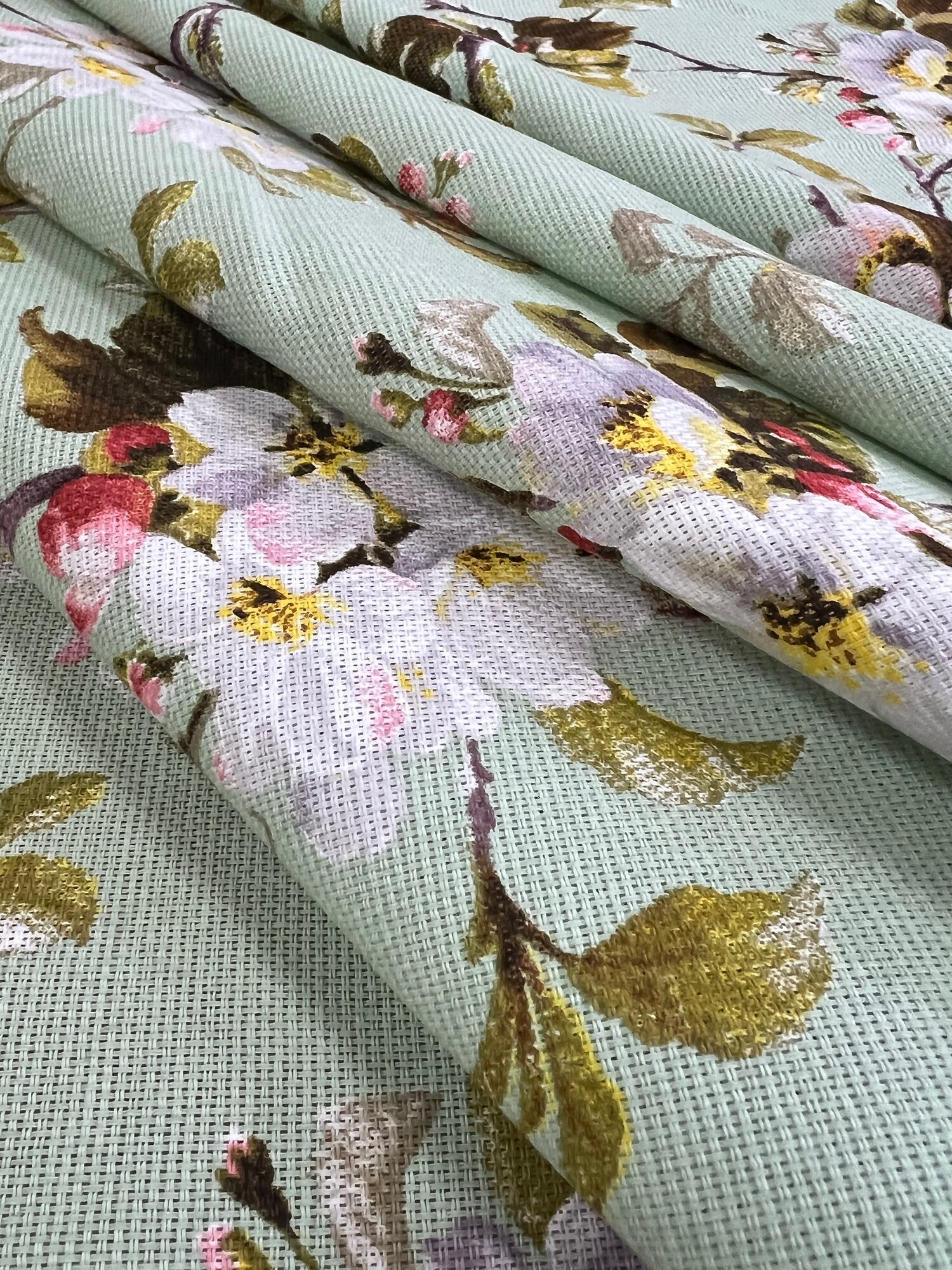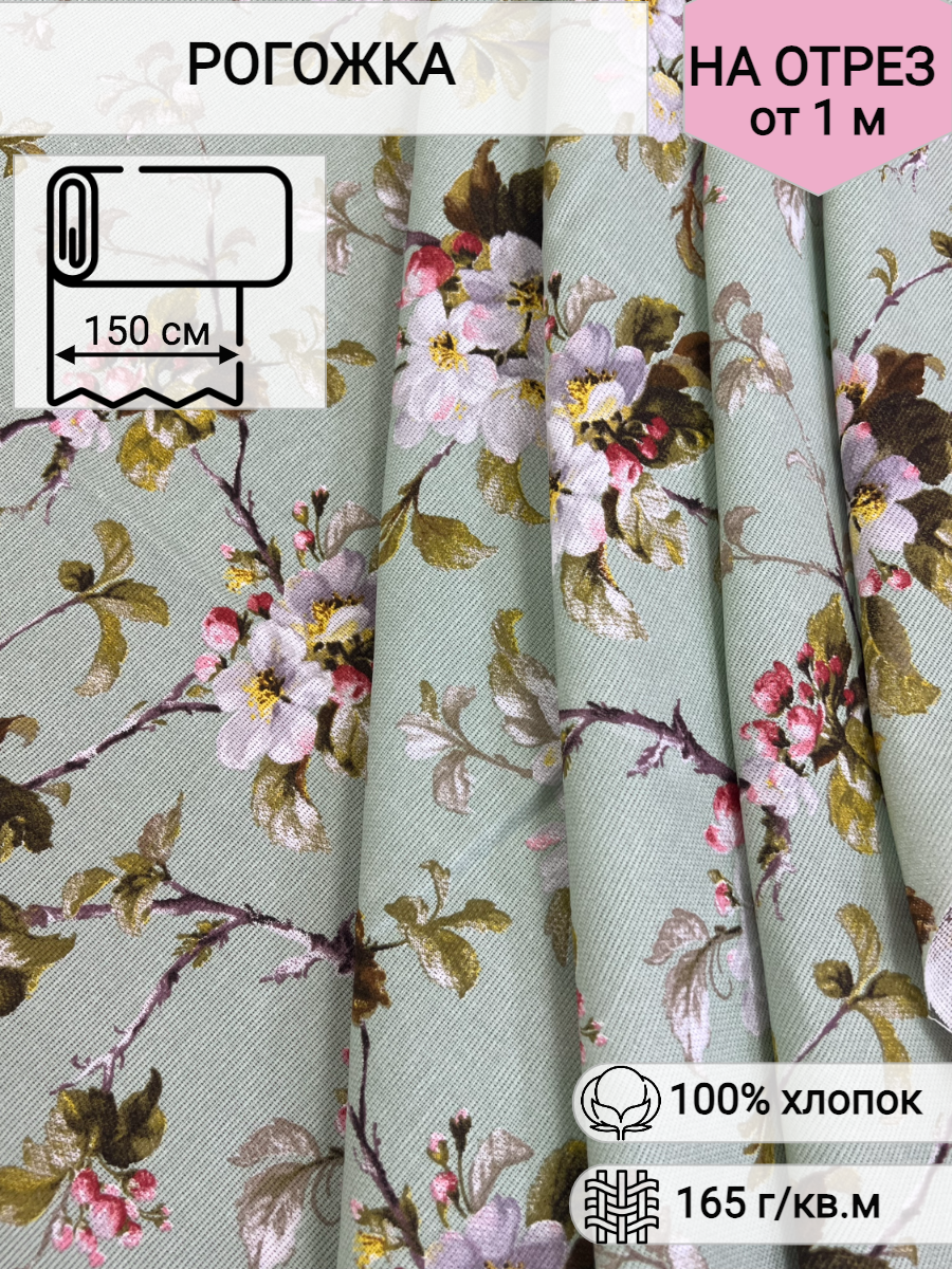 Ткань Рогожка набивная "Яблоневый цвет", цвет фисташковый, ширина 150 см, на отрез интересное: