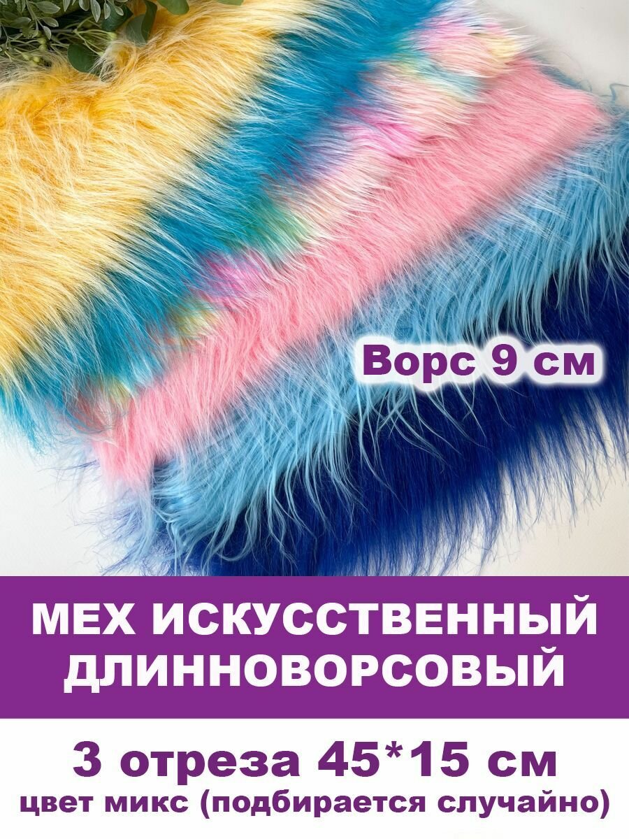 Купить Мех длинноворсовый (ворс 9см) для игрушек, мех искусственный для рукоделия, Набор 3 отреза цвет микс по 15*45 см.