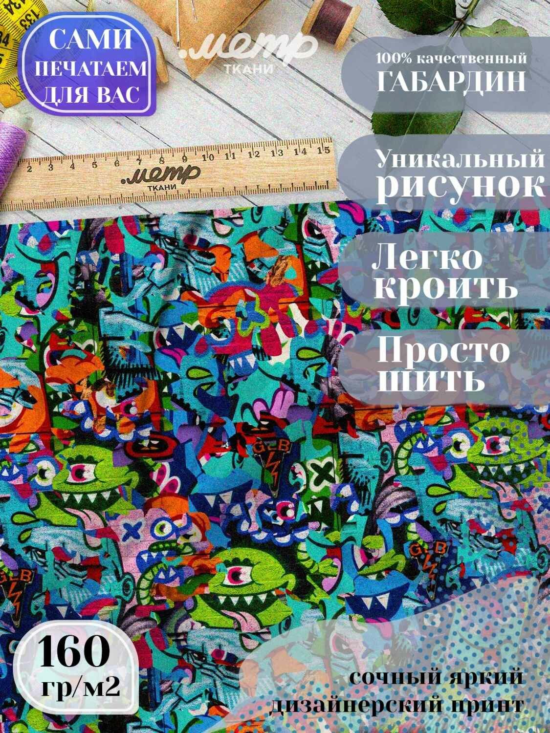 Ткань габардин с принтом для шитья, рукоделия, подушек. 150*100 см, 160 гр/м2, отрез любой длины