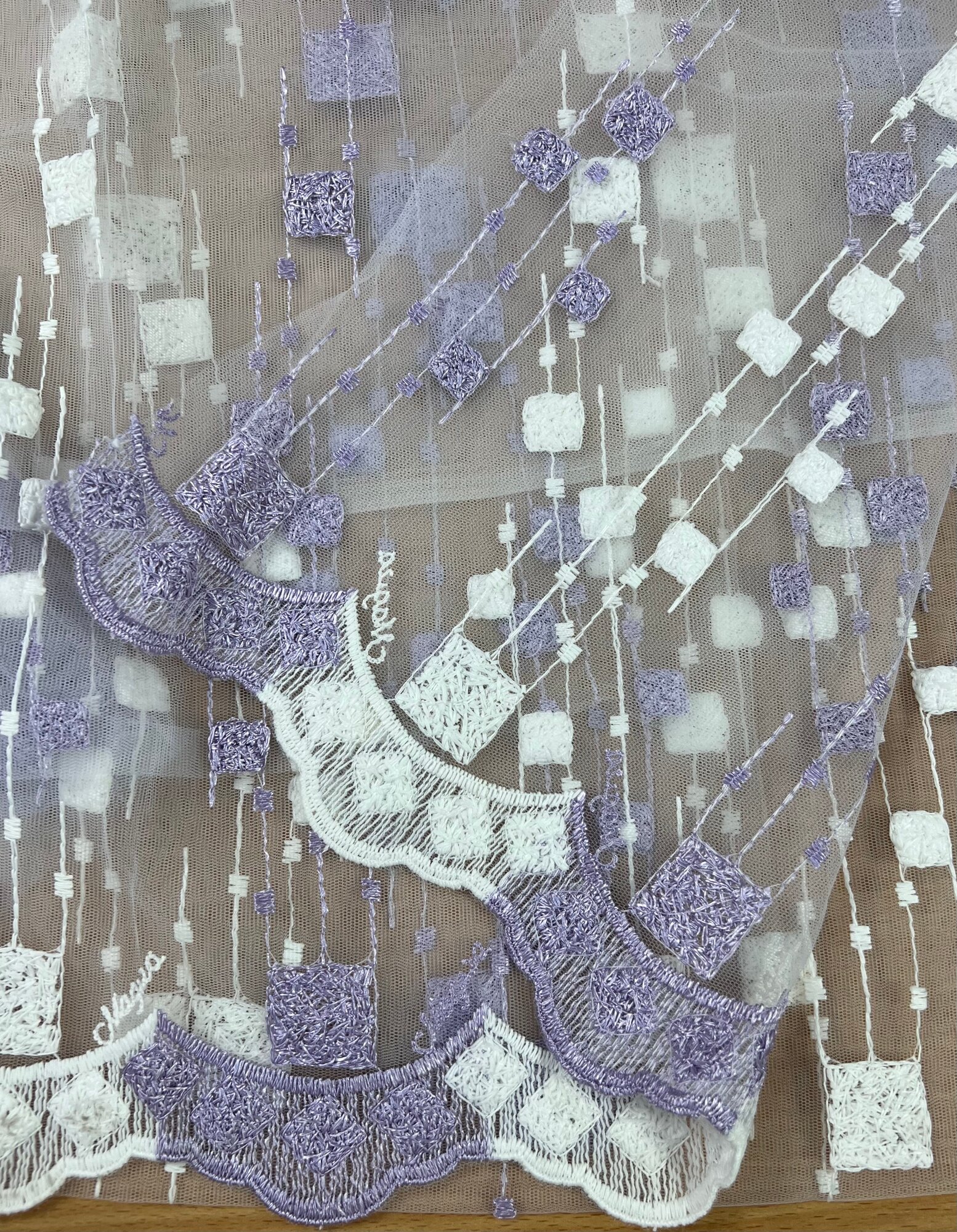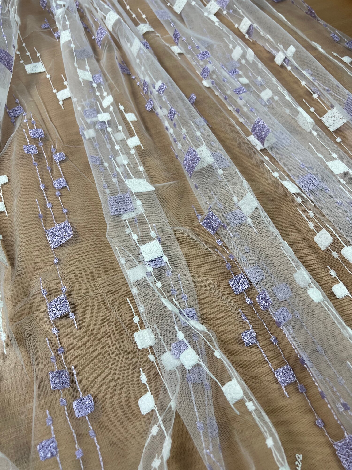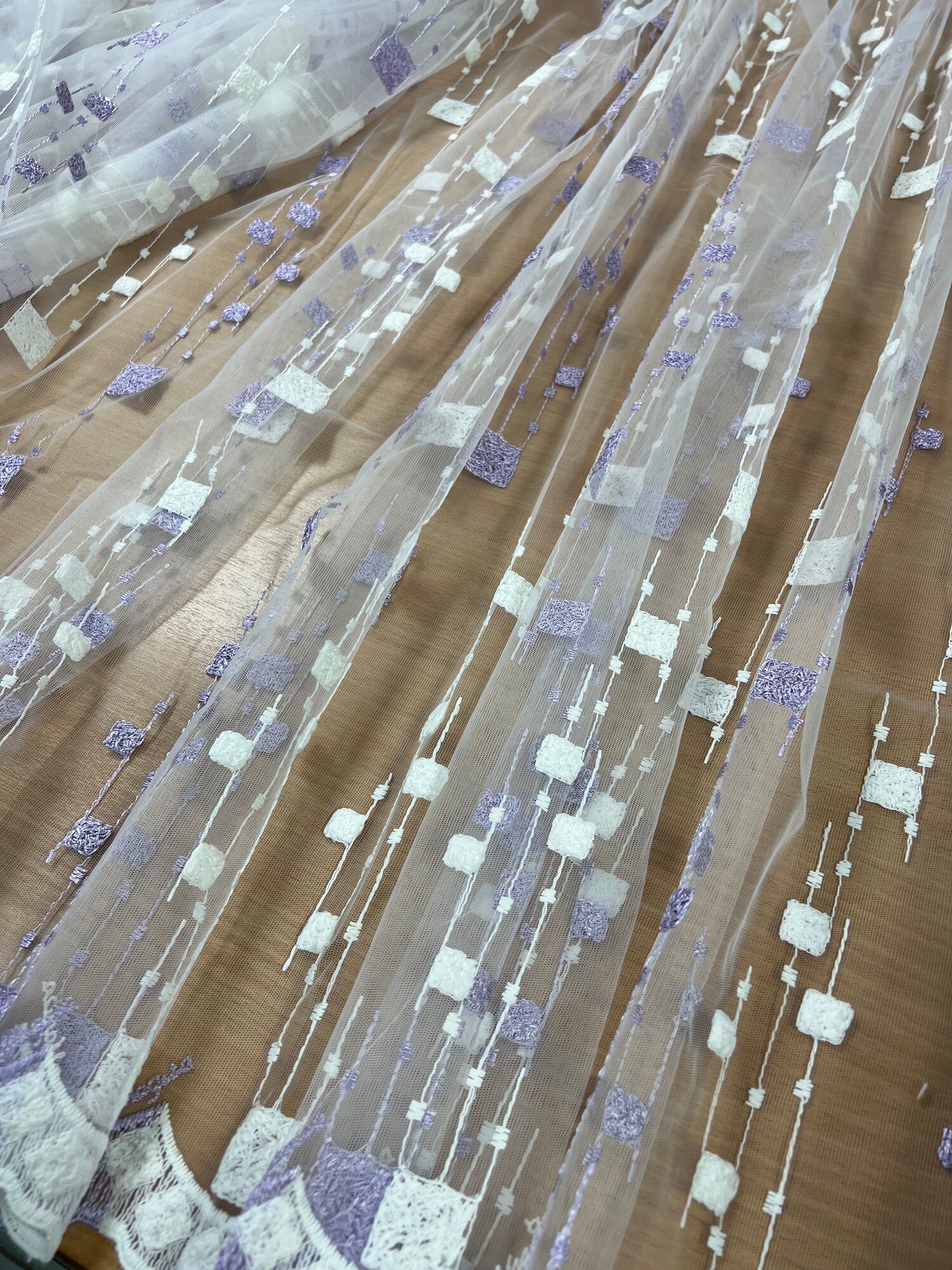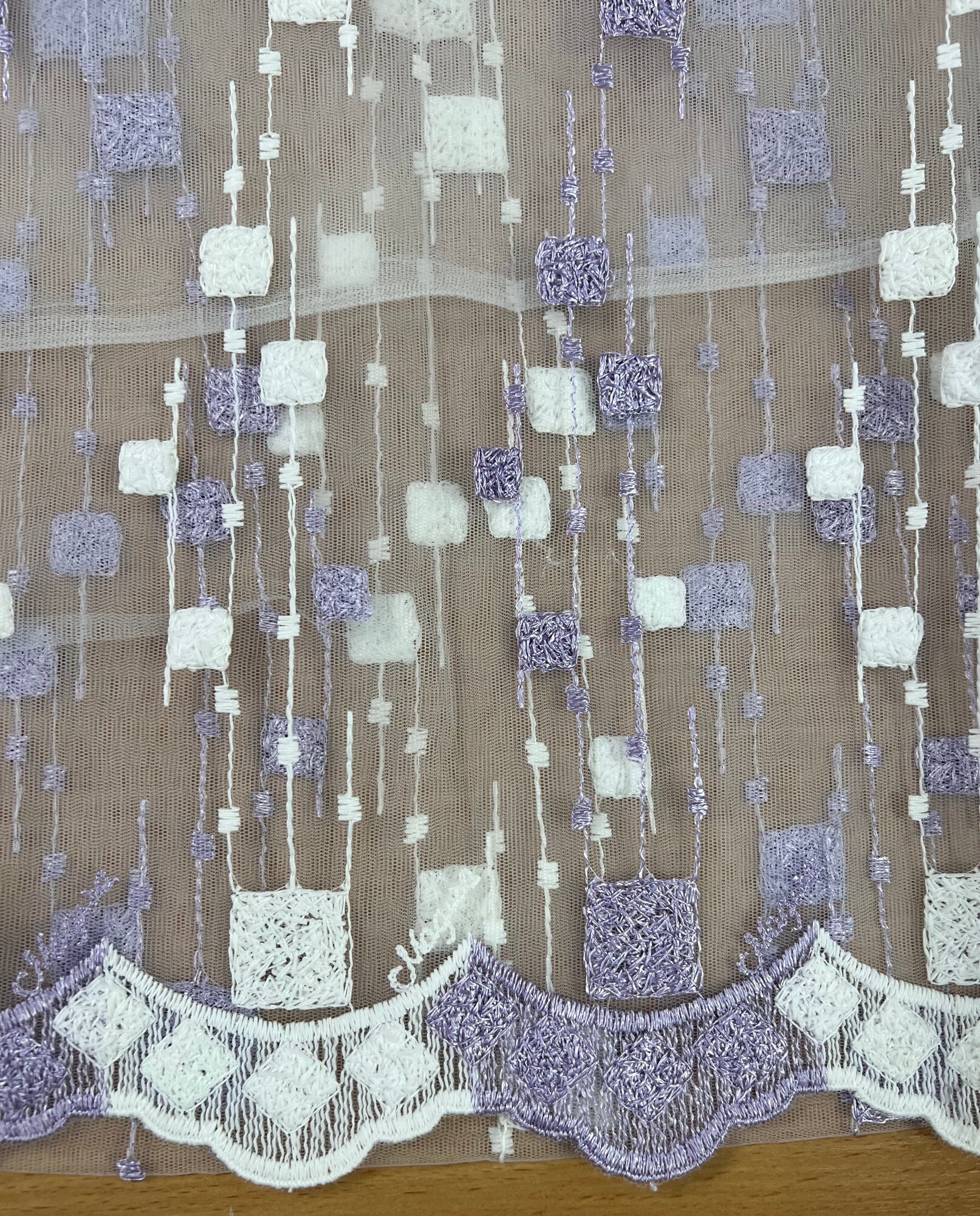 Ткань для пошива штор, Тюль "Сетка с вышивкой Квадраты", кремовая, вышивка кремовая и сиреневая, высота 300 см, пр-во Турция, на отрез интересное: