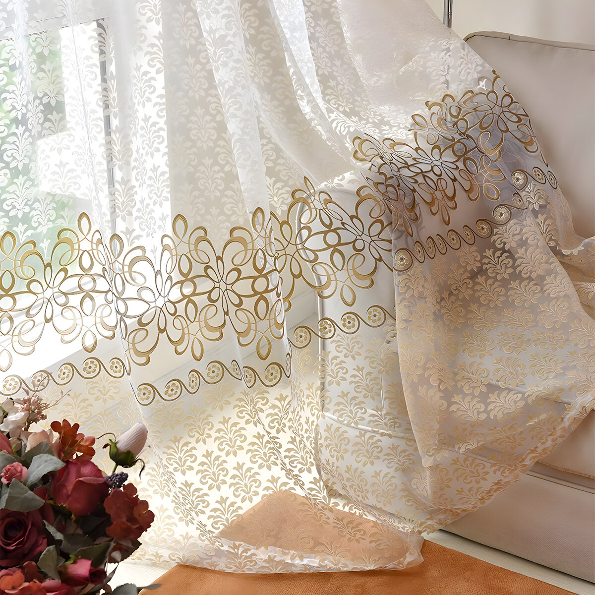 Тюль цветная с рисунком пион 300х250 см, вуаль белая для зала, спальни, кухни, длинная органза, занавески под лен