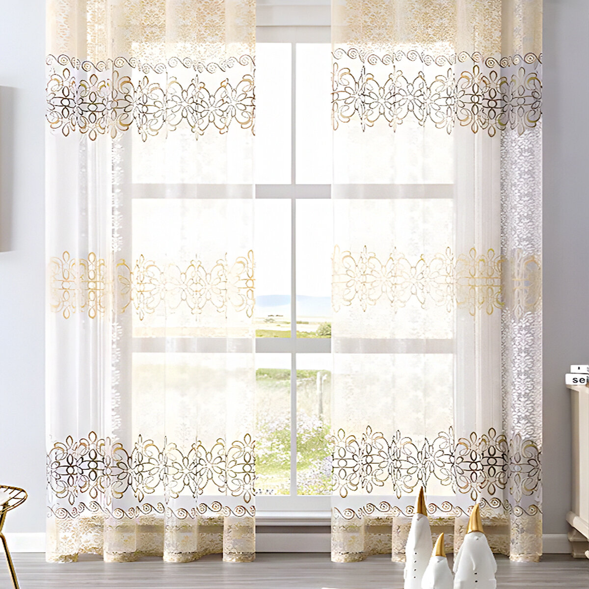 Тюль с рисунком виньетки цветная серая 150х250 см, вуаль белая для зала, спальни, кухни, длинная органза, занавески
