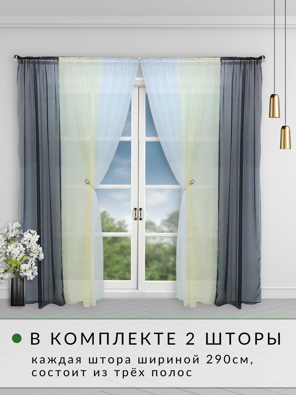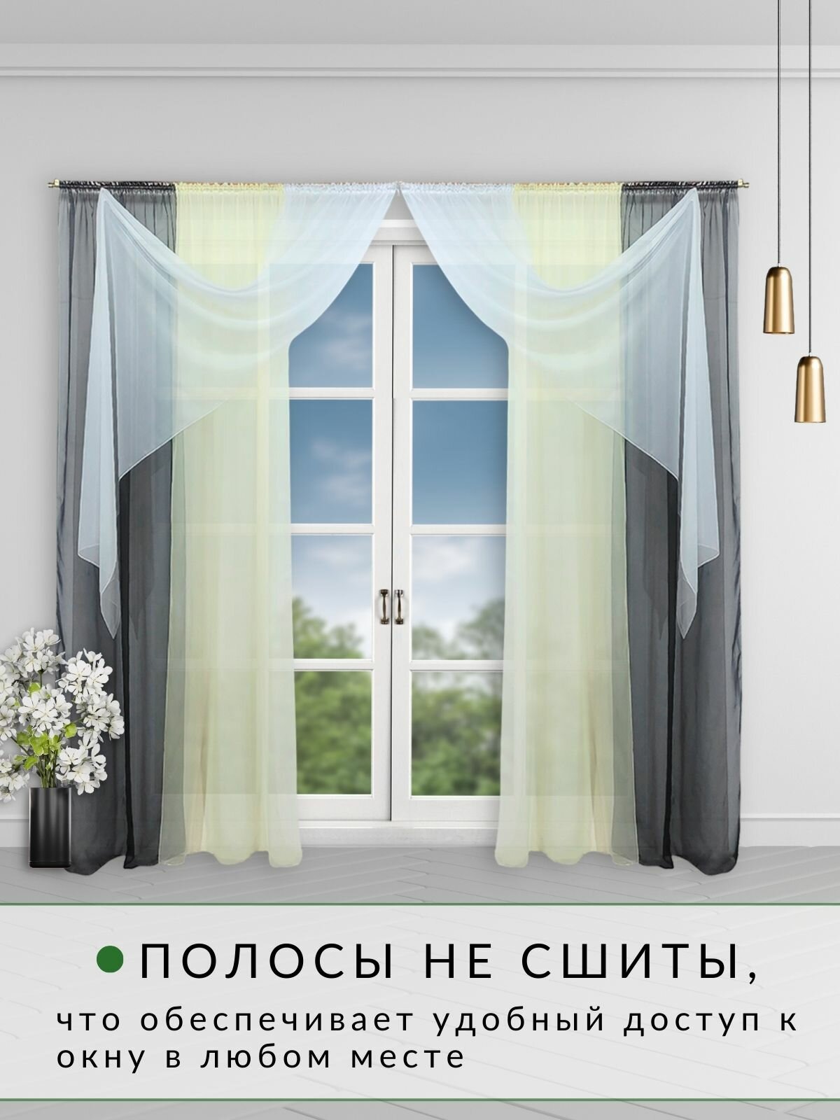 Шторы для комнаты с разрезами вуаль Домтекс35 "Радуга" зеленая мята/графит/белый, высота 250см