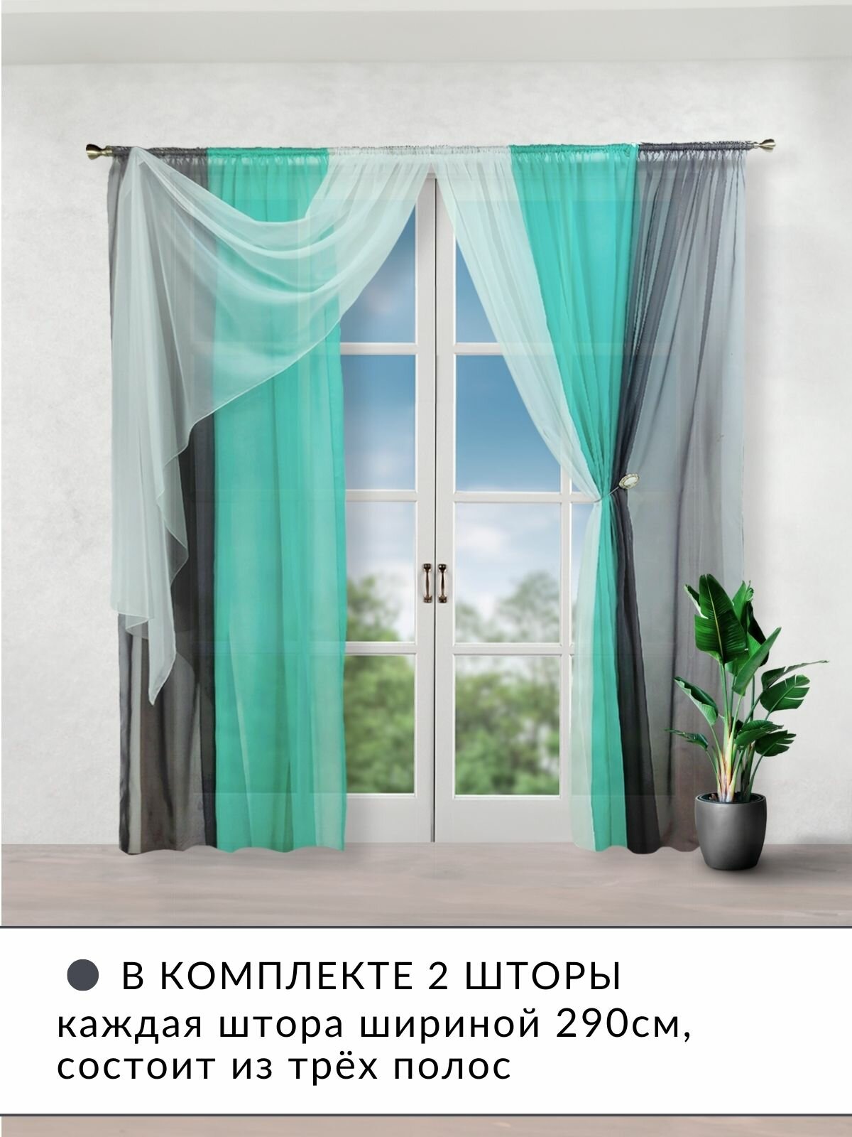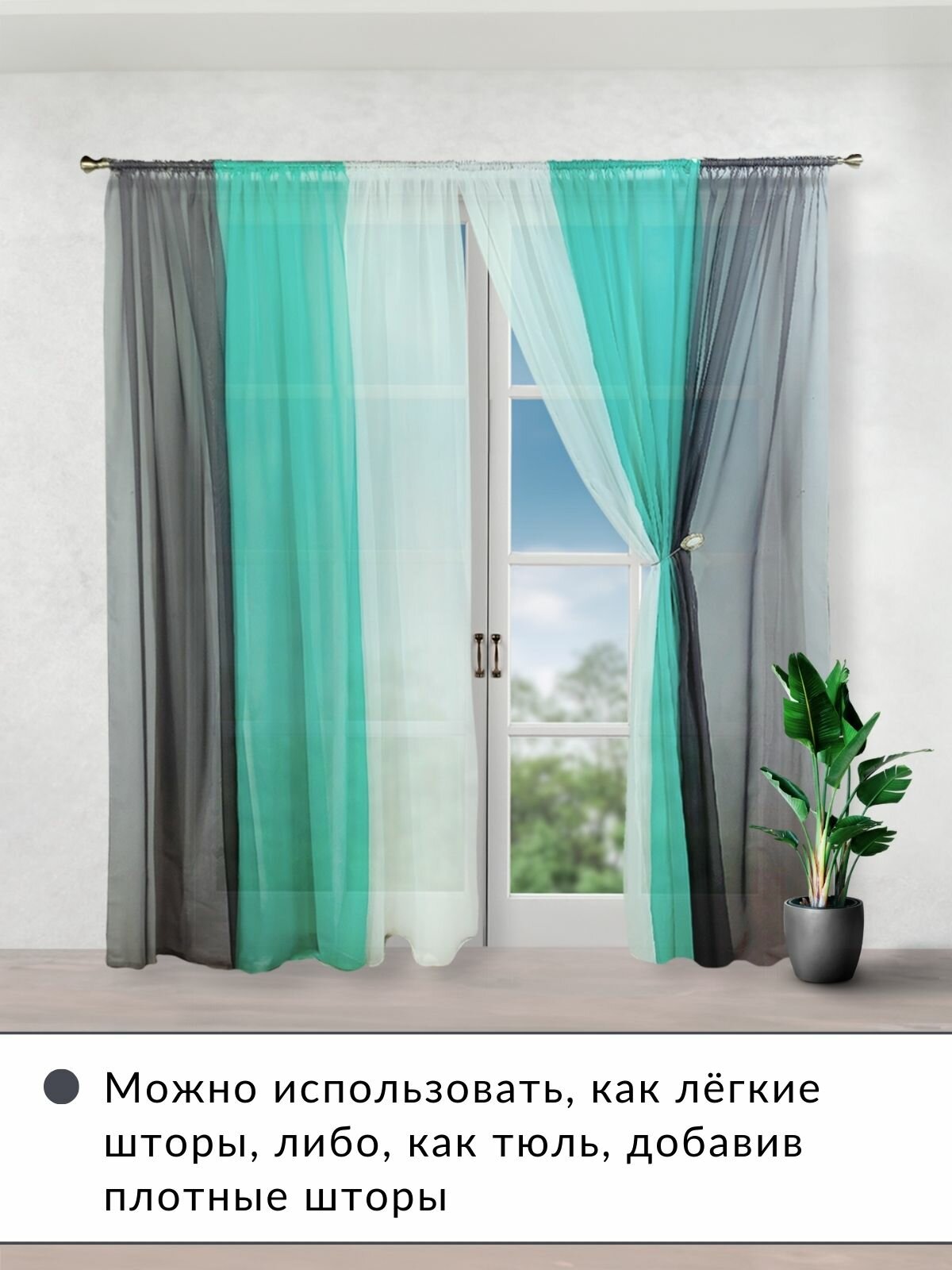Шторы для комнаты комплект тюль вуаль "Радуга" графит/бирюзовый, высота 250см