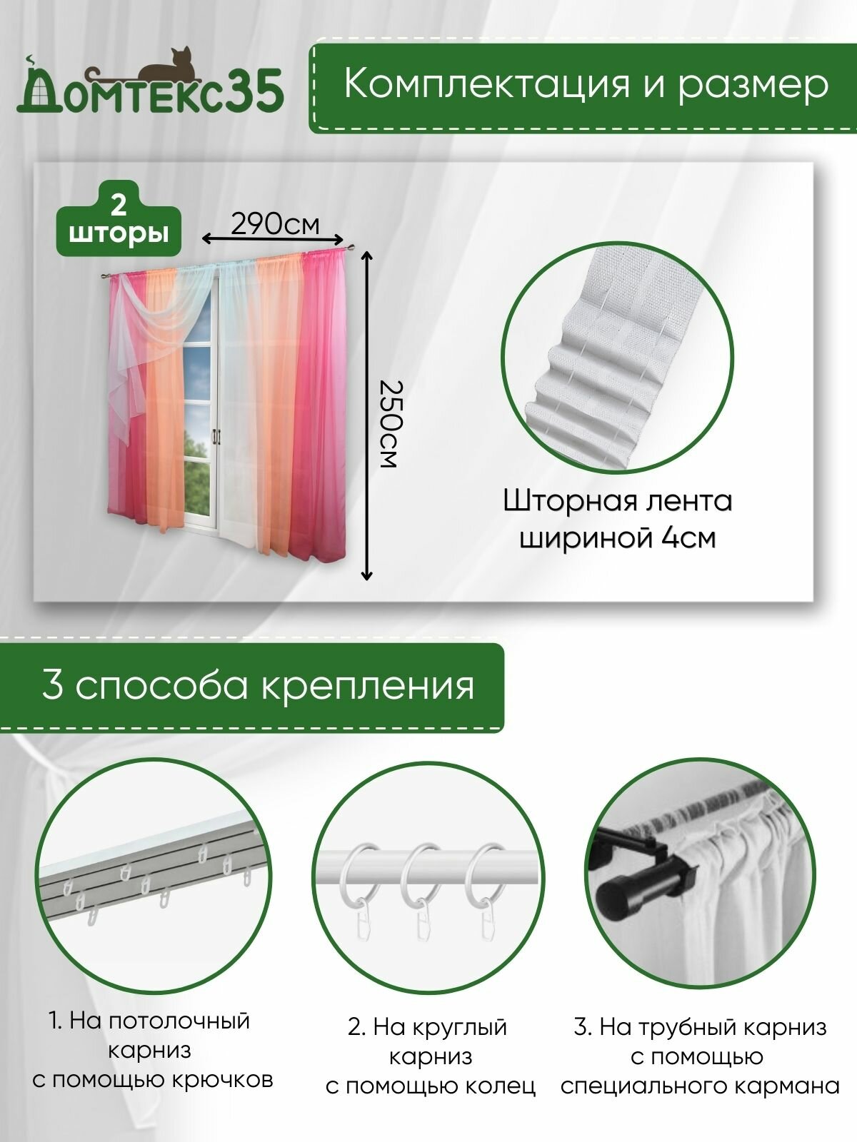 Шторы Домтекс35 Радуга, вуаль, крепление на шторную ленту, 580x250 см, серый/изумруд