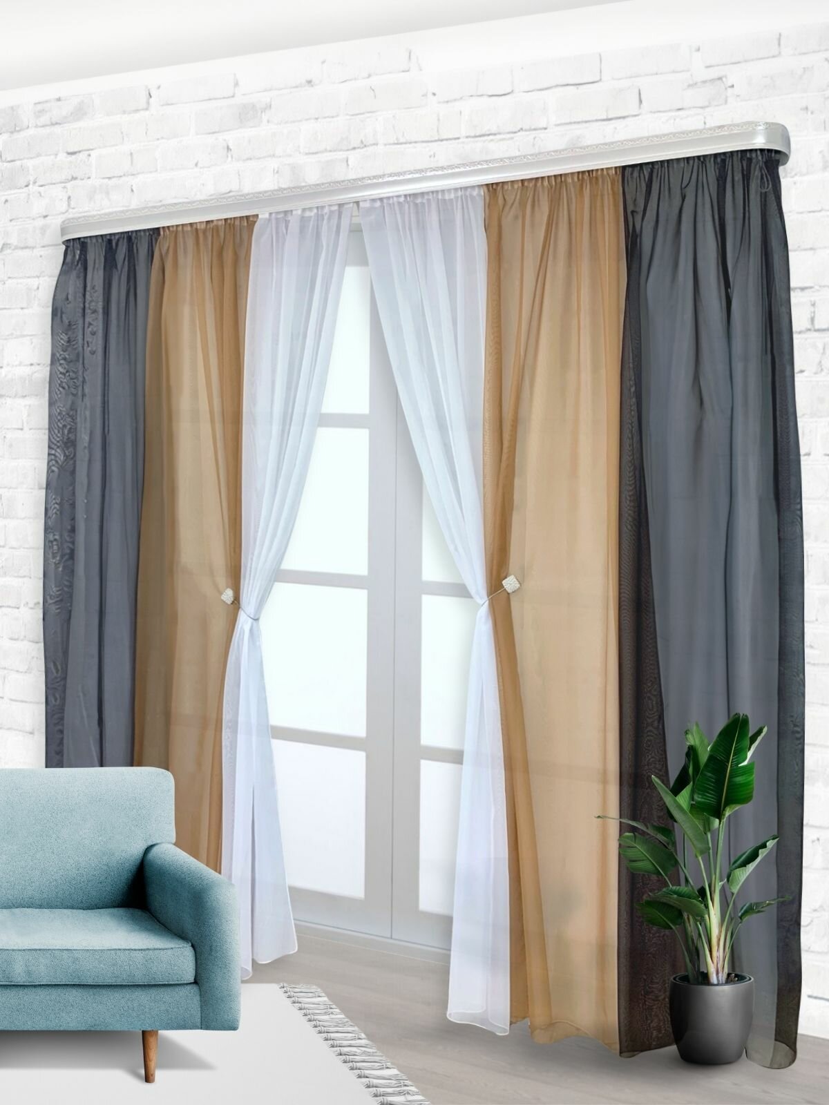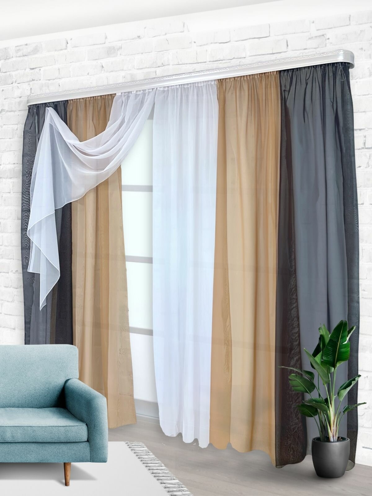 Купить Шторы для комнаты комплект тюль вуаль "Радуга" венге/бежевый, высота 250см
