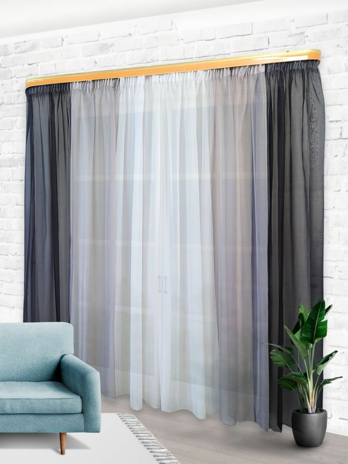 Шторы для комнаты комплект тюль вуаль "Радуга" графит/бирюзовый, высота 250см